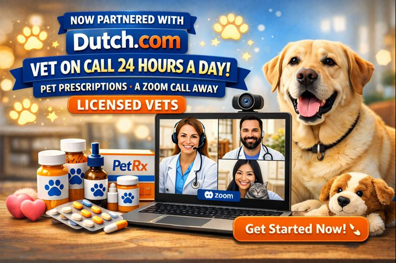 Get affordable online vet care and low-cost prescriptions without leaving home. Powered by licensed veterinarians through our partner, Dutch.com.