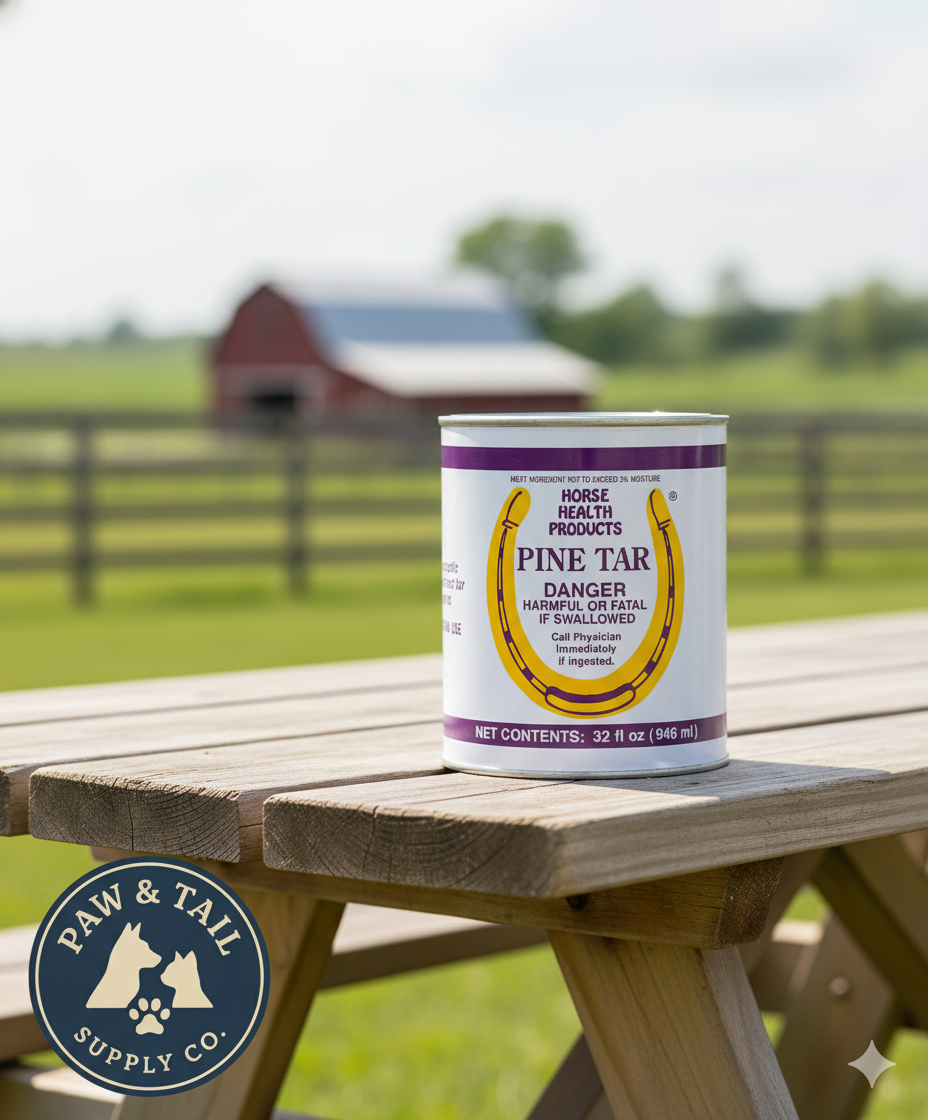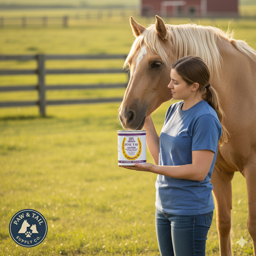 Farnam Pine Tar Hoof Care is a natural topical antiseptic for use on horse hooves. Helps retain hoof moisture and keeps hooves from cracking and splitting. Maintains hoof wall flexibility for healthy hooves. Natural, antiseptic, germicidal treatment formulated specifically for use on hooves.