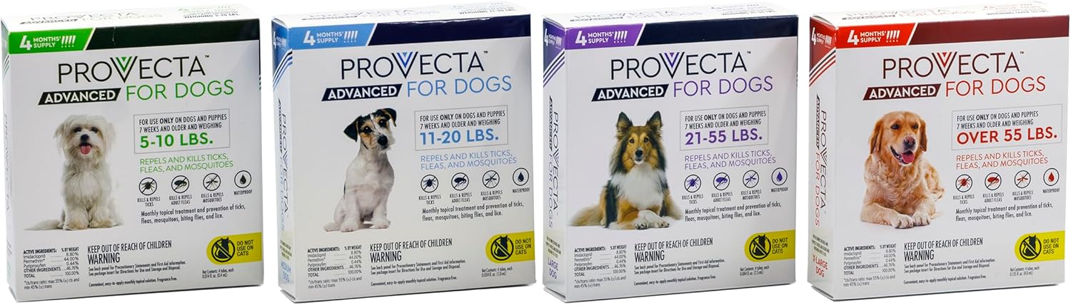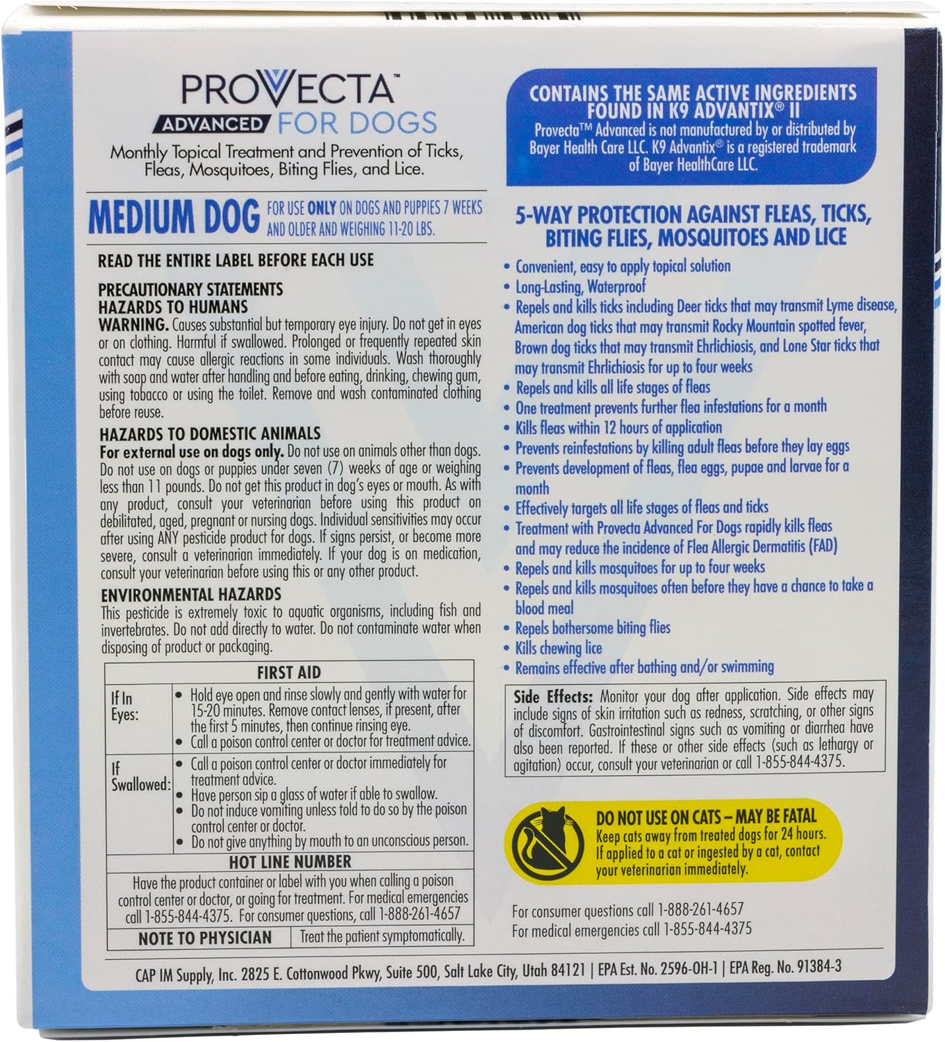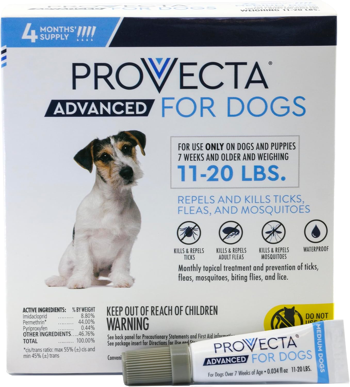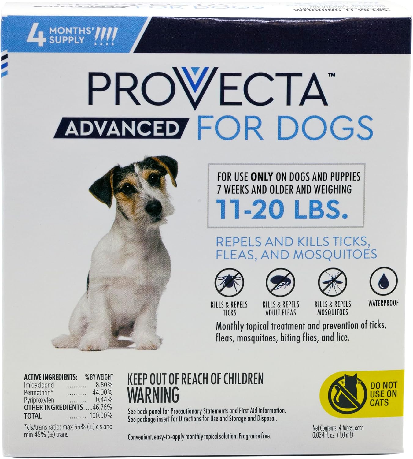 Provecta Advanced for Dogs 11–20 lbs is a once-a-month topical application that kills and repels fleas, ticks (Brown dog ticks, American dog ticks, Lone Star ticks, and Deer ticks), lice, and mosquitoes and aids in the control of biting flies. For use on dogs seven weeks of age and older. 4-month supply.