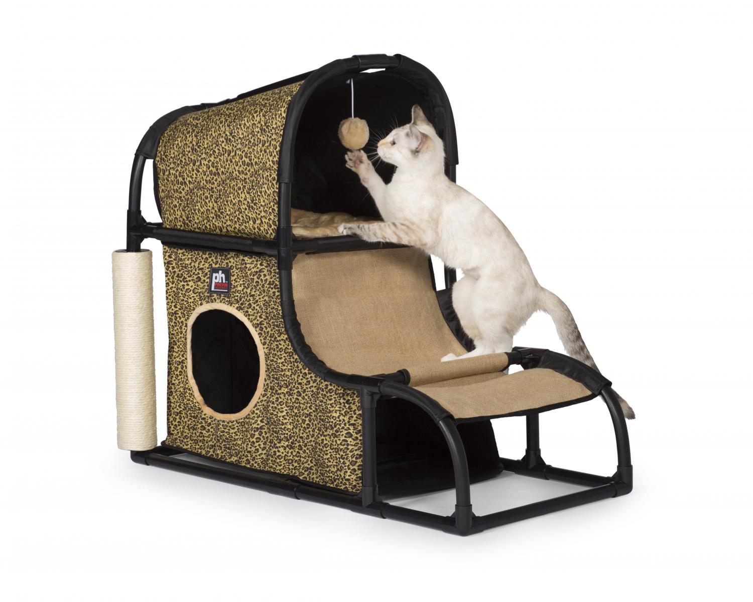 - Two hideaways – an elevated nook with dangling puff ball toy and plush mat plus a more secluded, lower hideaway