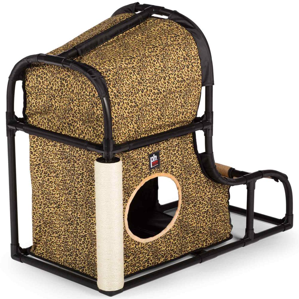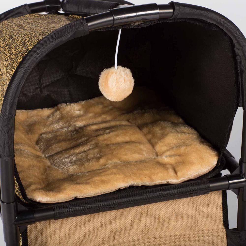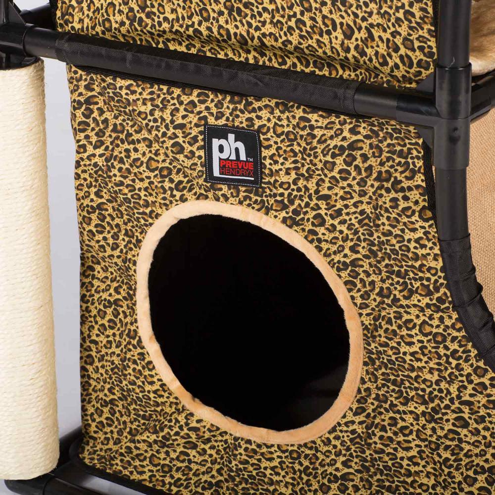 Prevue Pet Products Catville Loft 7220 in Leopard Print encourages your cat to be healthy, happy and active! Watch as kitty engages in frisky activity – playing with the dangling toy, scratching the sisal covered post or climbing in, out, over and around the Catville Loft. The hideaway arch provides an elevated view and contains super-soft plush bedding, perfect for relaxing or sleeping. Durable cloth rampway designed for active jumping, pouncing and running leads to the raised nook where a dangling puff-ball toy hangs playfully. Cats will scratch and stretch along the sisal covered post, getting a good workout while grooming nails and exercising paws. A lower, secluded, hideaway den provides a safe and secure feeling and is also ideal for playing hide & seek. With areas for playing, napping, lounging, scratching, pouncing, climbing and hiding felines love the full range of amenities created to satisfy behavioral instincts while discouraging destructive behavior and alleviating boredom.