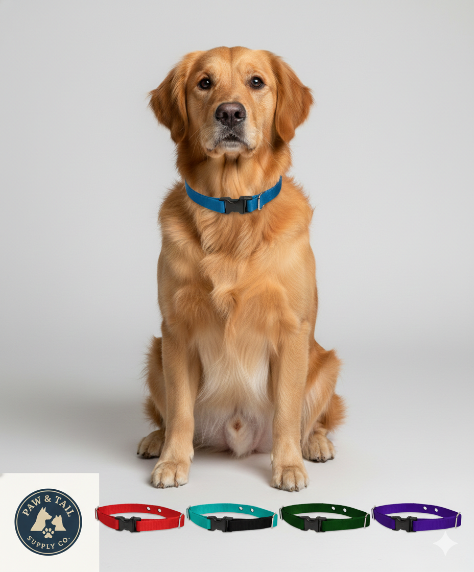 The LupinePet Underground Fence Collar is compatible with DogWatch, Invisible Fence Brand, and PetSafe receivers. It features durable construction with heat-sealed holes, a strong YKK plastic buckle, and an easy side-release design. The collar has no D-ring and is intended for underground fence use only, not for leash walking.
