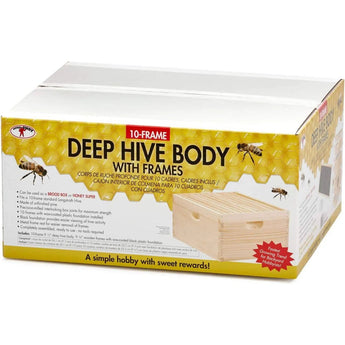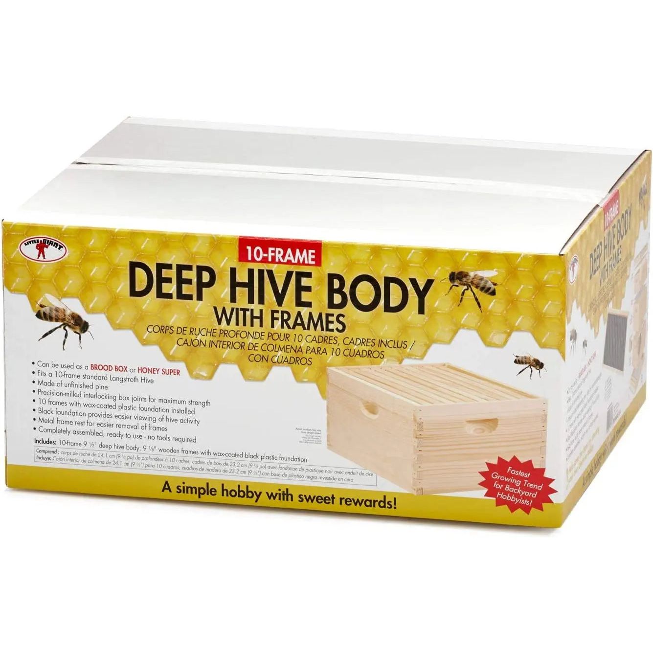 The Little Giant 10-Frame Deep Hive Body with Frames is pre-assembled for easy setup and use, including a pre-installed wax-coated black plastic foundation for easy viewing of hive activity. Made of unfinished pine, the Deep Hive Body can be used as either a Brood Box or Honey Super and is precision-milled for maximum strength. Ready to be added to your hive right out of the box! Includes 10-frame 9.5-inch deep hive body, and 9.125-inch wooden frames with wax-coated black plastic foundation.