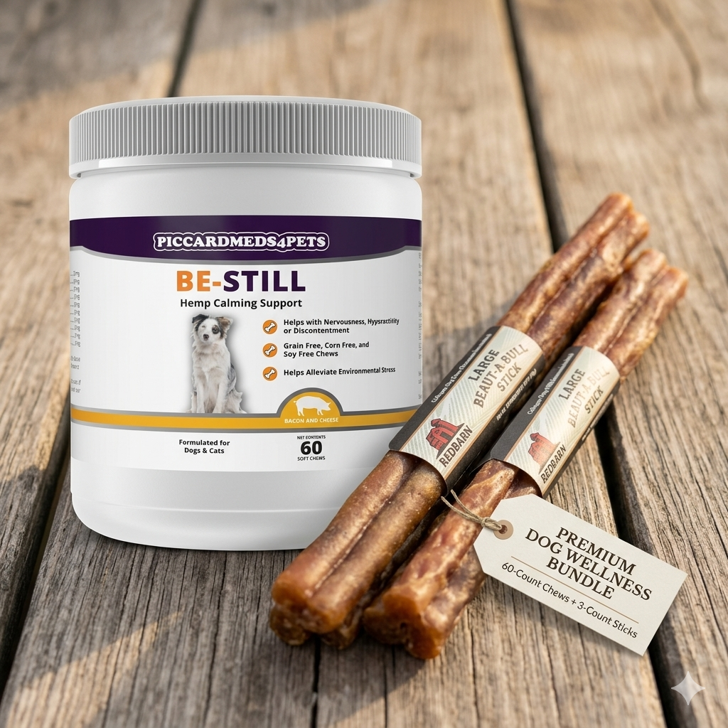 Give your dog natural relaxation support while satisfying their chewing instincts with this wellness bundle featuring PiccardMeds4Pets Be-Still Hemp Calming Chews and a Beaut-A-Bull Collagen Stick.