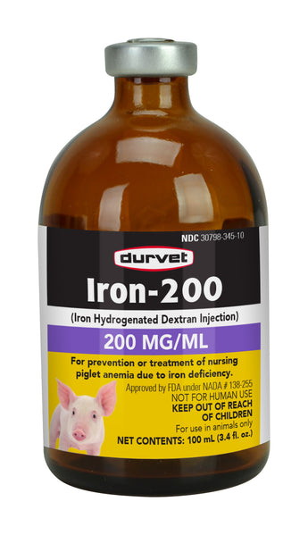Durvet Iron-200 sterile injectable solution prevents and treats iron deficiency anemia in nursing piglets. Quick absorption, reduces losses, promotes optimal growth and health. Easy syringe-ability. 100mL bottle for swine iron supplementation.