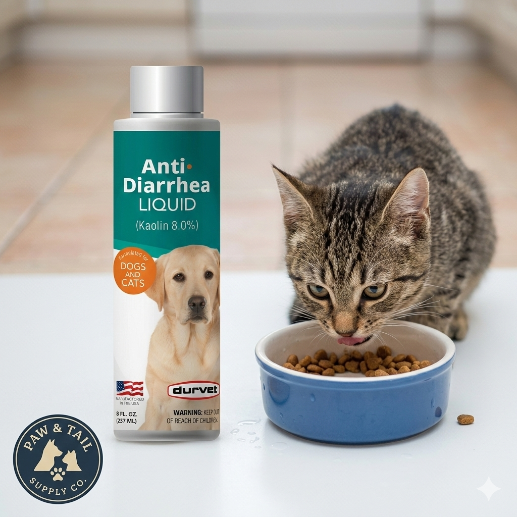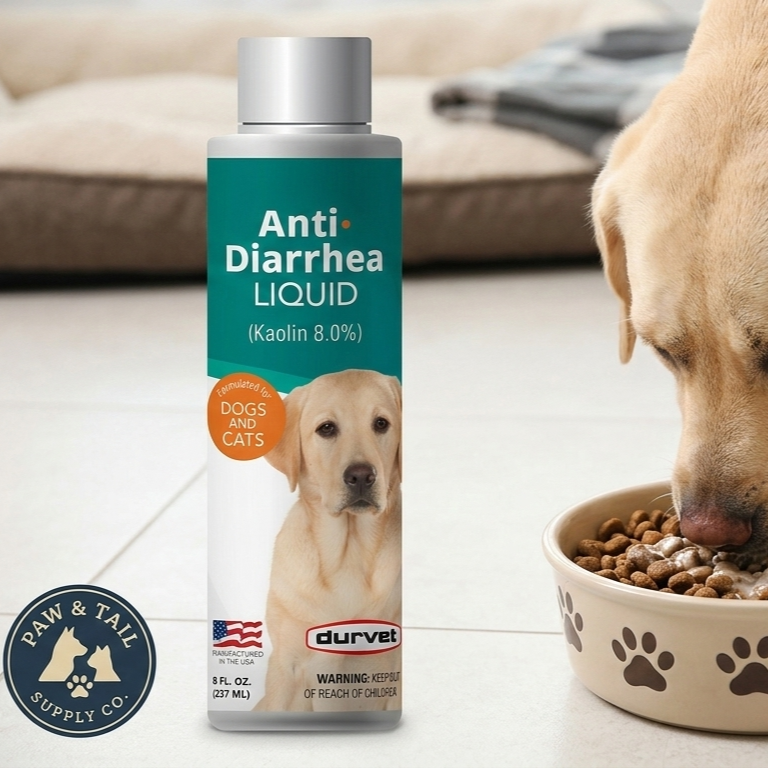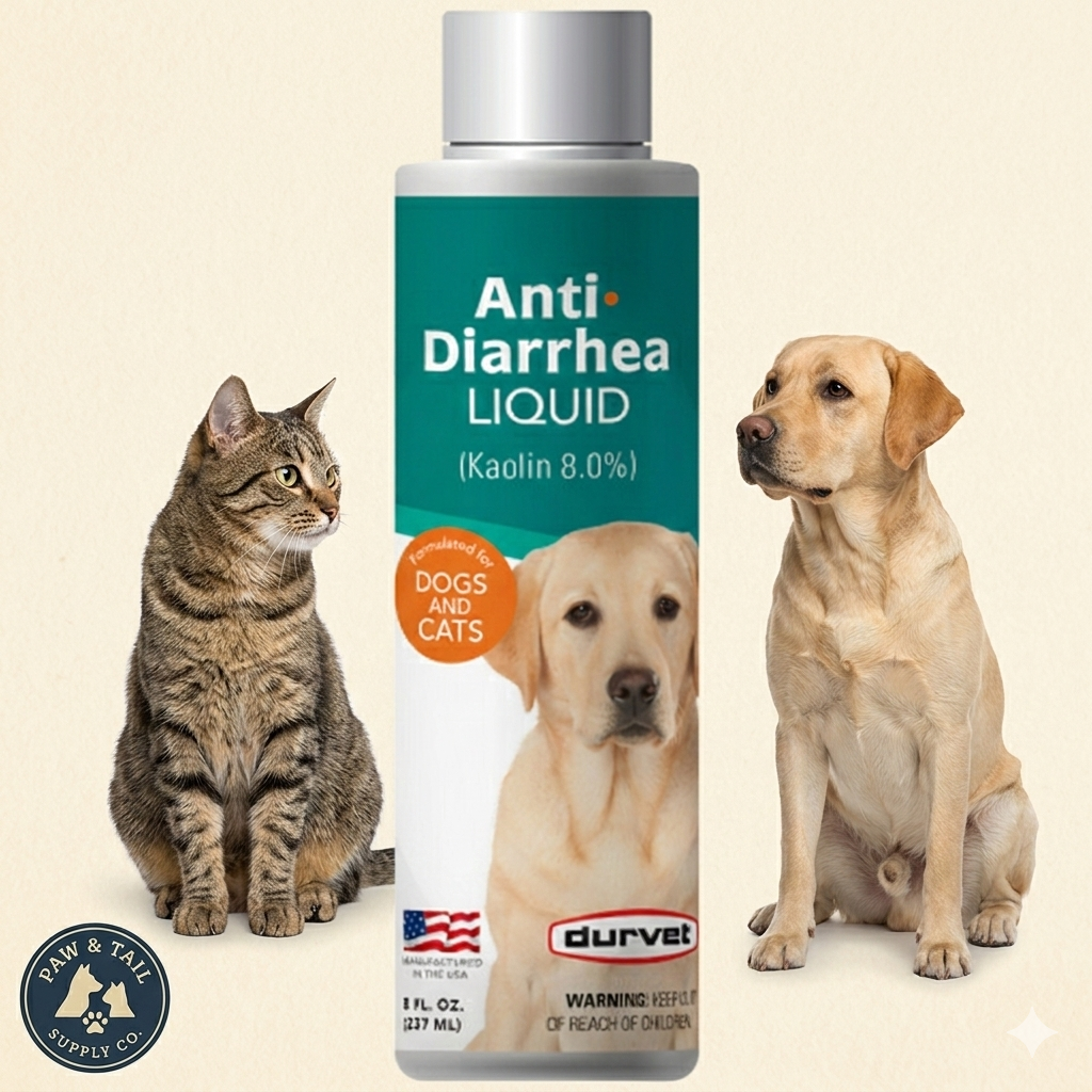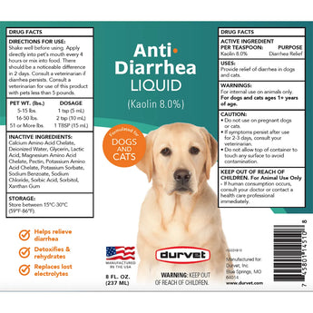 Durvet Anti-Diarrhea Liquid (8 oz) for dogs and cats 1 year+ helps support digestive upsets by detoxifying and rehydrating while replacing lost electrolytes. Formulated with 8% kaolin. Easy-to-use liquid for at-home pet care.