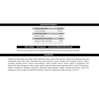 Guaranteed Analysis: Crude Protein min 28.0% Crude Fat min 20.0% Crude Fiber max 3.5% Moisture max 10.0% Omega-6 Fatty Acid min 2.20% Omega-3 Fatty Acid min 0.30% Calories Content (Calculated) 3,831 kcal/kg 422 kcal/cup ME.
