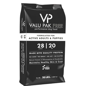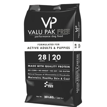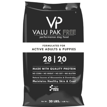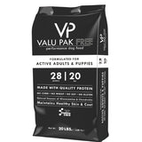 Valu-Pak Free 28-20 Dry Dog Food (Black Bag) is formulated for active dogs and puppies. Made with 2 meats in the USA! Fortified with Omegas 3 & 6. Corn, wheat, soy, and gluten-free. Made in the USA by Specialty Feeds, family-owned & operated for over 50 years.
