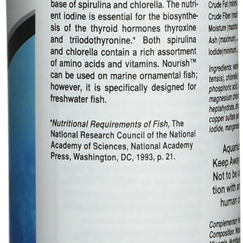 The nutrient iodine is essential for the biosynthesis of the thyroid hormones thyroxine and triiodothyronine. Both spirulina and chlorella contain a rich assortment of amino acids and vitamins. Nourish can be used on marine ornamental fish; however, it is specifically designed for freshwater fish.