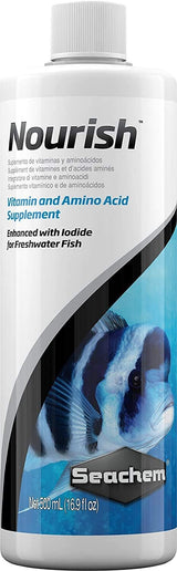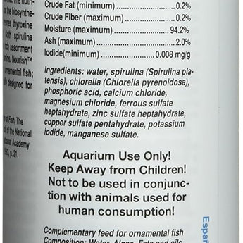 Nourish is a comprehensive vitamin, amino acid, and trace element supplement developed to address nutritional requirements commonly associated with long term closed system housing of freshwater ornamental fish. Nourish contains potassium iodide in a heavy base of spirulina and chlorella.