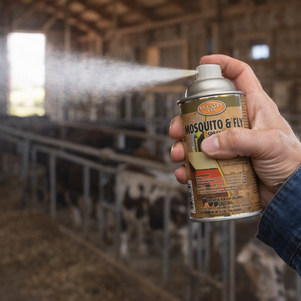 Country Vet Mosquito & Fly Spray 6.9 oz is an ozone-friendly insecticide designed for farms, barns, dairies, kennels, factories, offices, and food-handling areas. Effectively kills flies, mosquitoes, gnats, and small flying moths.