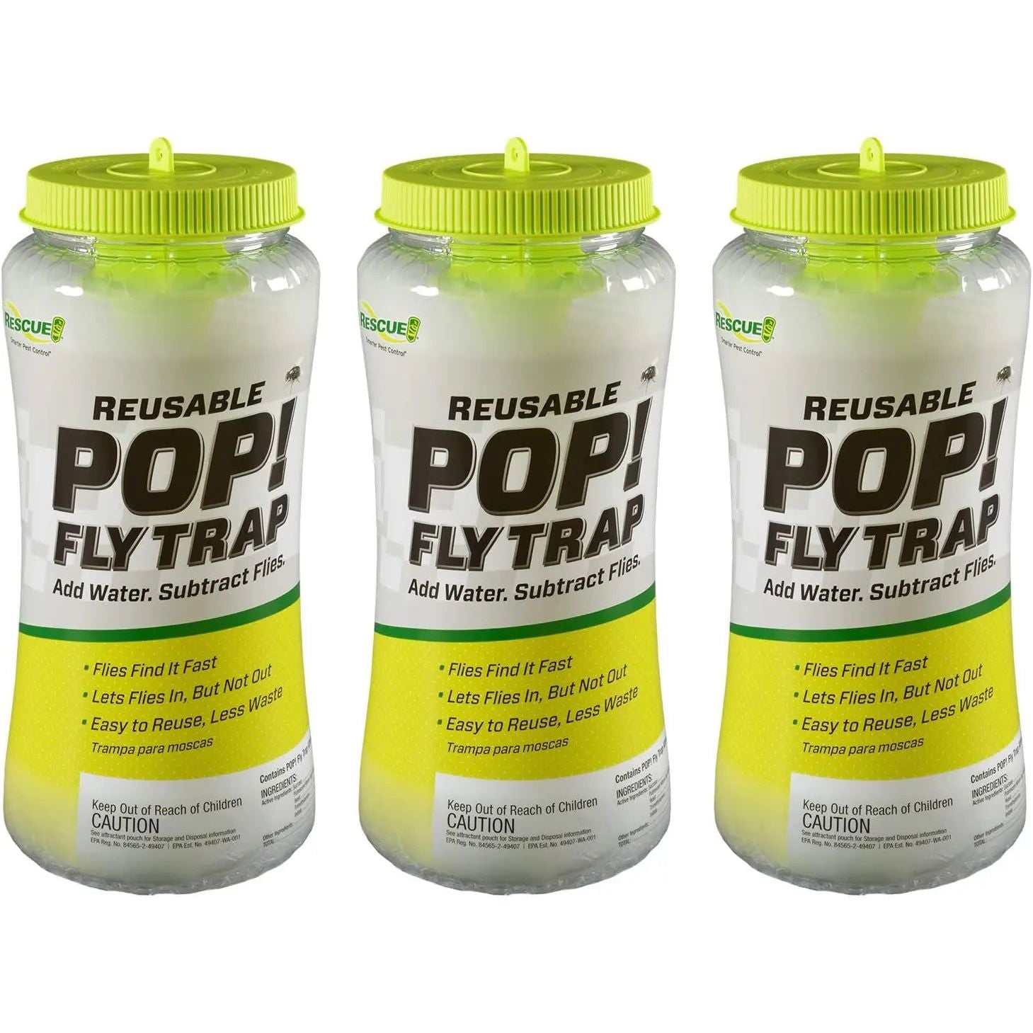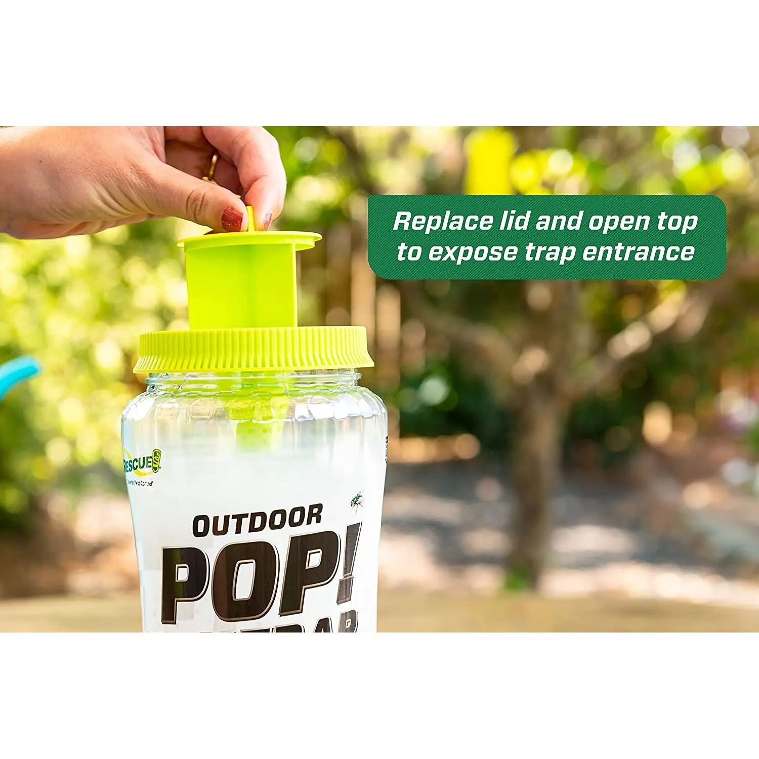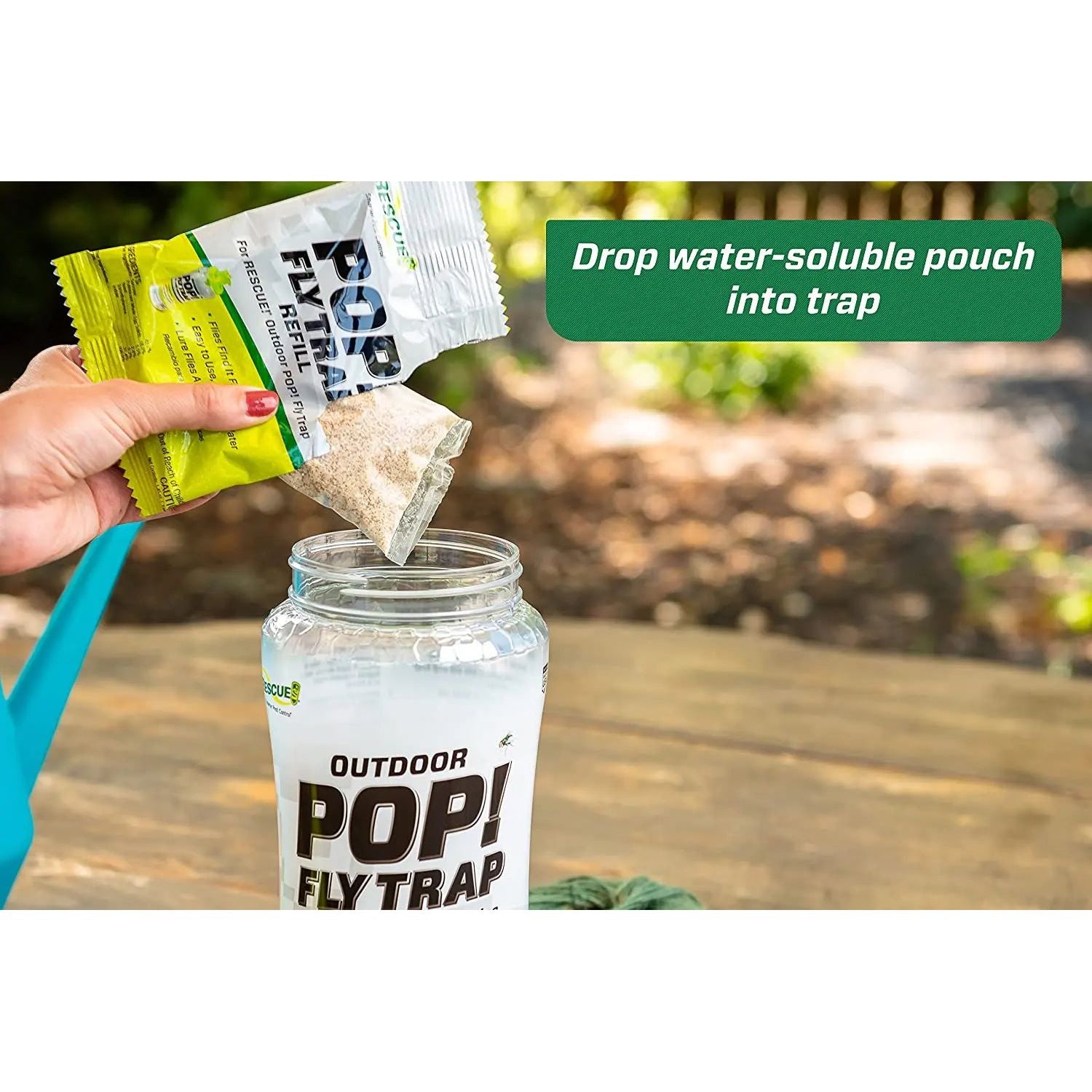 The RESCUE! POP! Fly Trap comes with one packet of water-soluble attractant packaged inside a foil pouch. Just empty the contents of the foil pouch into the trap and add water. Lured by the scent, flies enter through the yellow top cap and drown in the water. Refill attractants for the POP! Fly Trap are sold in single-use pouches, allowing the trap to be reused over and over. Once the RESCUE! POP! Fly Trap has fulfilled its desired use and reuse, the plastic components can and should be recycled.