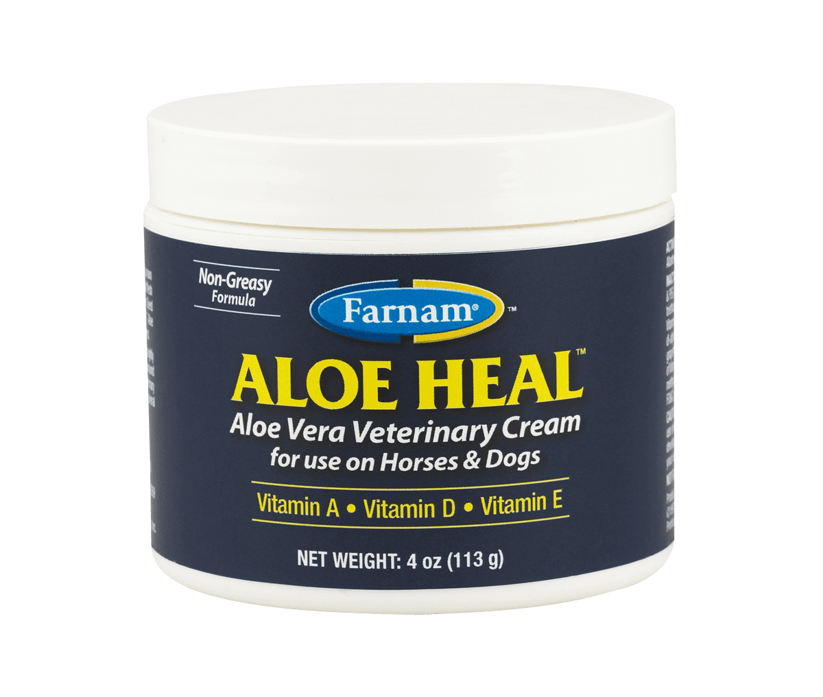 Farnam Aloe Heal Veterinary Cream cares for your horse's wounds with excellent first aid properties. Combines the soothing, healing properties of natural aloe vera, vitamins, and oils. Soothing, healing action keeps wounds moist for quick healing. Specifically formulated for minor cuts, abrasions, skin irritations, proud flesh, and cracked heels. Contains high concentration of natural aloe vera, plus vitamins A, D, and E, and safflower and sunflower seed oils. Non-greasy formula. For horses and dogs. 4 oz.