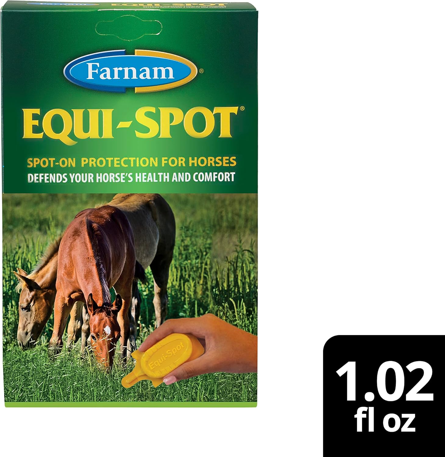 Farnam Equi-Spot Spot-On Fly Control for Horses is a waterproof insecticide that kills and repels houseflies, stable flies, face flies, horn flies, eye gnats, mosquitoes, and ticks. Water and sweat-resistant formula proven effective even when your horse gets wet. Ideal for pastured horses. 3-pack provides 6-week supply of long-lasting protection.
