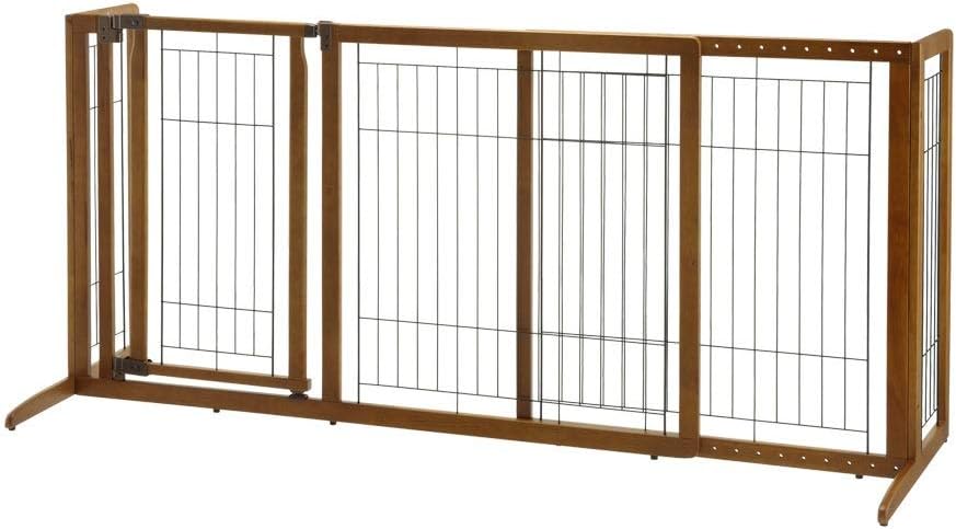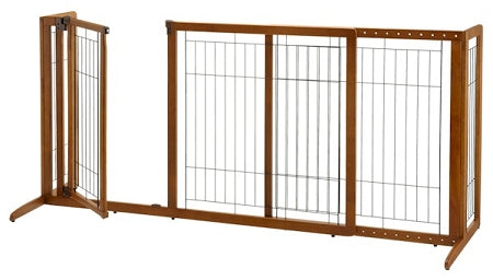 Richell's brand new Large Deluxe Freestanding Pet Gate with Door fits doorway and hallway openings from 61.8" to 90.2" wide! In addition, the specially designed walk-thru door opens up in both directions, locks automatically and stays open at 90° to enable you to move freely from one area to another.