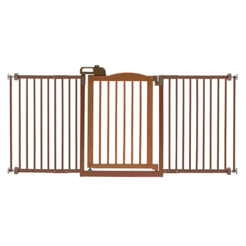 Richell's One-Touch Gate II Wide is a tension mount gate designed to fit a wider selection of doorways, from 32.1-62.8" without damaging wall surfaces. The door handle allows you to open the wooden door in either direction with the touch of one button! One-Touch II Wide comes in Autumn Matte or Origami White to complement your home.