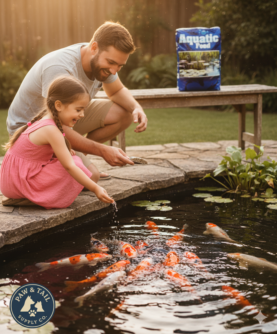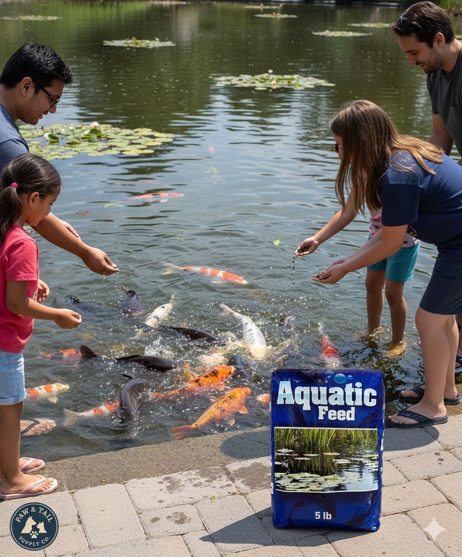 Feed once a day, either early morning or late afternoon. Feeding should always take place at the same time and from the same location. Feed approximately the same amount they will clean up in 20 to 30 minutes or at the rate of 3% to 5% of the bodyweight of the fish per day. If food is not consumed, reduce the amount in accordance. Over feeding will result in oxygen depletion in the water causing a sour pond.