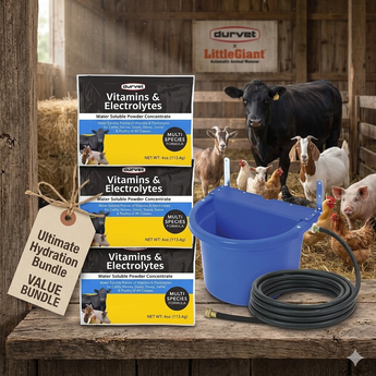 This bundle includes three bottles of Durvet Vitamins & Electrolytes Concentrate (4 oz each) along with a Little Giant 4 Gallon Automatic Animal Waterer. Designed for ease of use, it helps streamline your routine by pairing a commonly used supplement with a durable, gravity-fed watering solution.