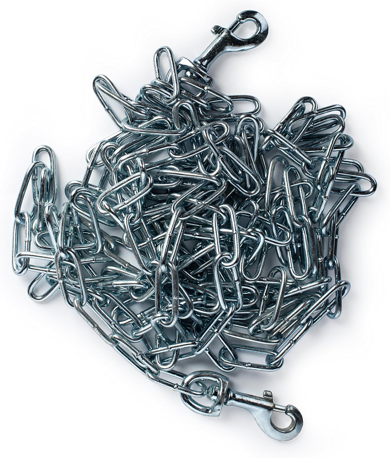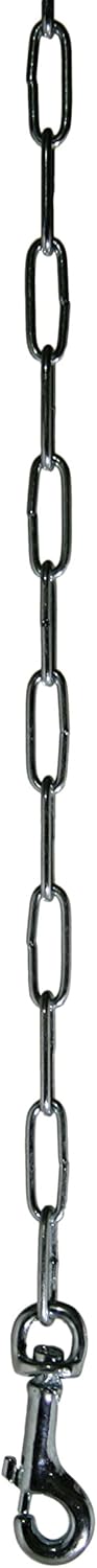 Prevue Pet Products medium-duty 15Æ tie-out chain 2114 is designed for dogs up to 55 lbs. Zinc plated welded oval links are strong, ensuring your dog stays safe and secure. Premium quality die-cast iron swivel bolt snaps at both ends connect easily and prevent tangling. Medium duty tie out chain is 15 foot long and 2.5 mm in diameter.