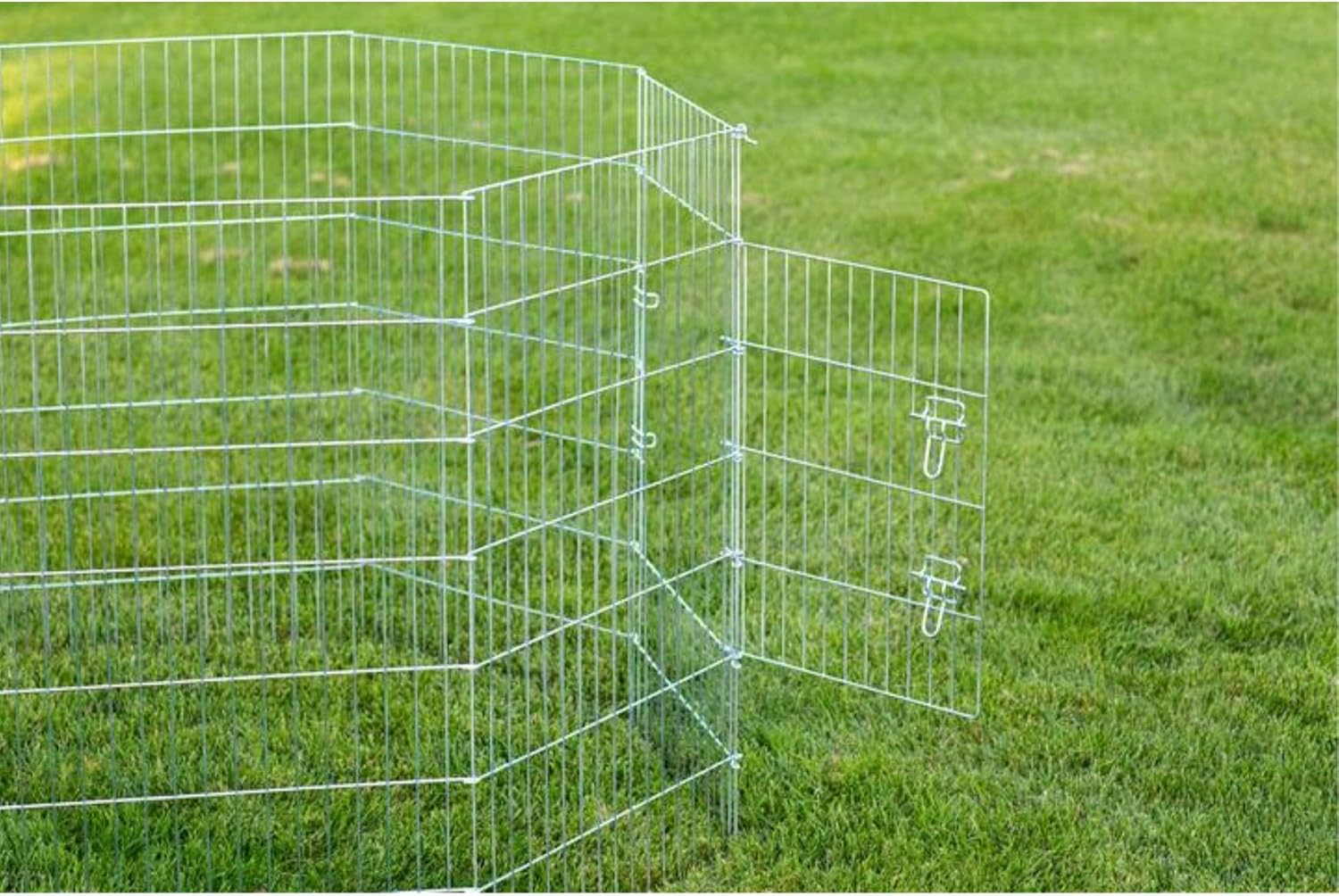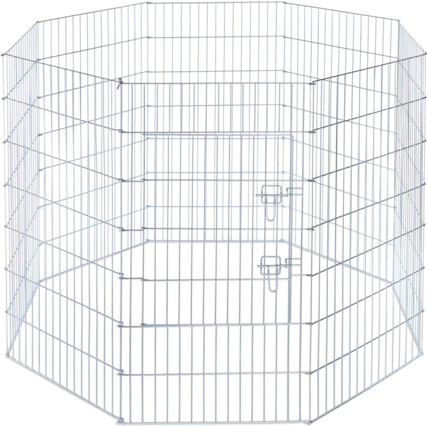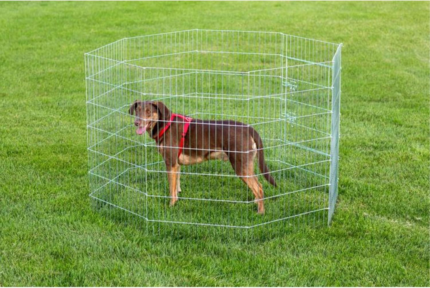 Prevue Pet Products Exercise Pen for Dogs 40142 is heavy duty and assembles easily, no tools required! 8 panel exercise pen features rust-resistant Bright Zinc finish over solid steel rods and includes grounding stakes. Ideal for small and medium sized dogs, each panel measures 24ÆÆ Wide and 42ÆÆ High. Front access door has 2 secure latches and measures 18 1/4" Wide and 23 1/4" High. Exercise Pen folds flat for storage or travel and measures approximately 57ÆÆ in diameter when assembled. To set it up simply take it out of the box, make sure the door is in the lower registry of the main panel, slide the connector pin (4 1/2" L) through the connection loops and it's good to go. Additionally, the 4 grounding stakes can be used to secure exercise pen into soil.