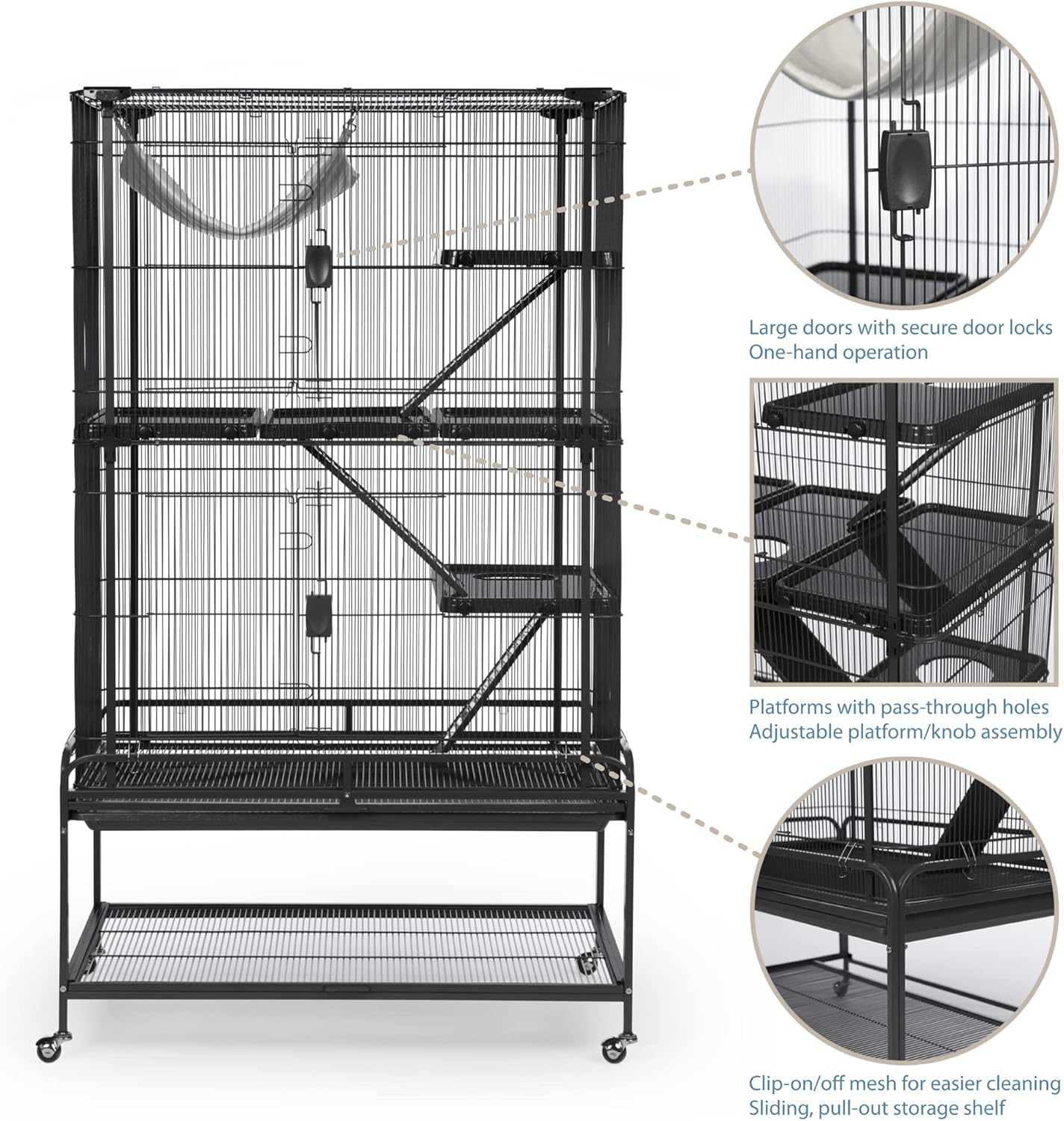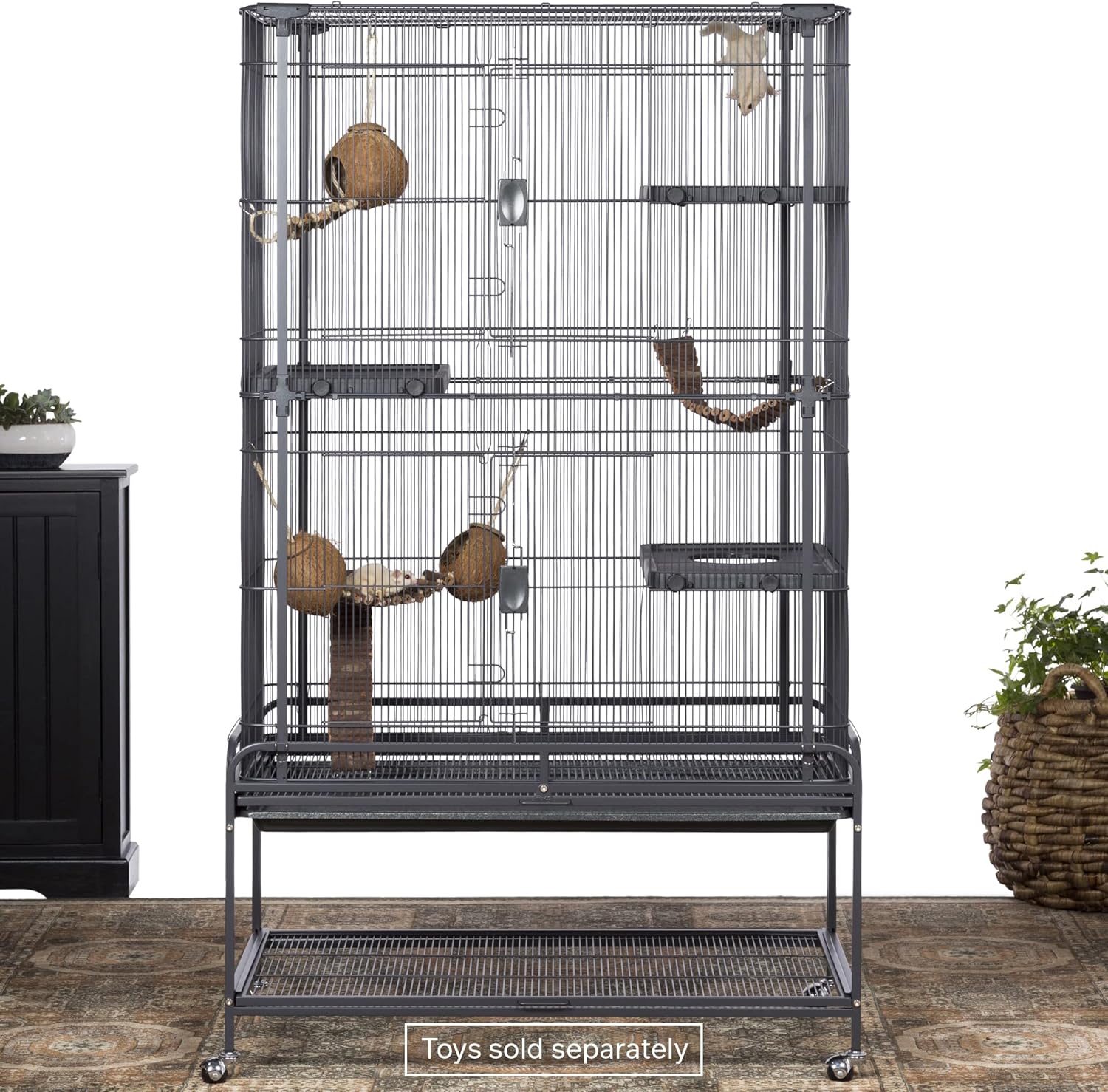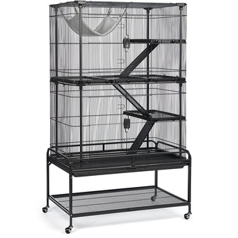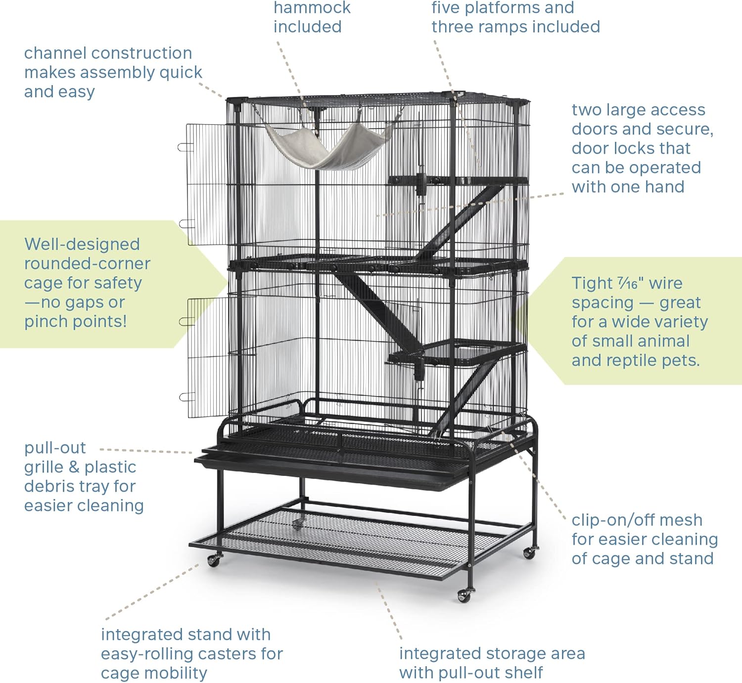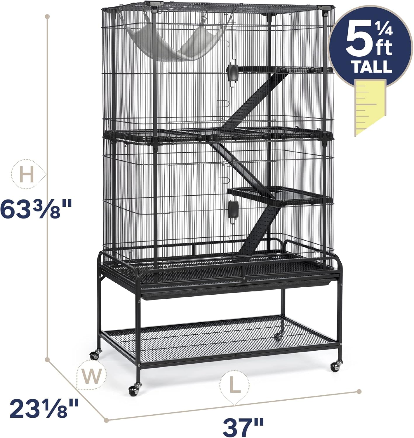 Prevue Pet Products Deluxe Critter Cage 484 is a safe and spacious home for a wide variety of small animals. Exceptional engineering makes our critter cage easy to assemble and provides a paw friendly design – no gaps or pinch points Lightweight, rust-resistant,metal construction is heavy duty with rails, clips and alignment tabs to keep cage parts aligned, strong and sturdy. Cage comes complete with five shelves with twist knob closure, three ramps and a super soft plush hammock. Pet parents can comfortably access the cage interior through two large entry points, cage doors close easily and securely with our simple two-finger locking mechanism. Doors swing open wide providing full interior cage access for interacting with your pet or cleaning. The removable grille and tray make this cage easy to clean and are held in place with a windbell lock. A solid fit into the cage base provides extra stability while metal and hard rubber casters allow you to easily move the cage and lock into place as needed. Use the built in shelf to store extra toys or treats. Expertly engineered in the USA, all Prevue cages undergo independent lab testing to conform to the highest levels of pet safety. Suitable for small animals, ferrets, sugar gliders, rats, chinchillas, hedgehogs, tortoises, lizards, chameleons, iguanas and more, our Deluxe Critter Cage measures 37’’ long, 23 1/8’’ wide and 63 3/8’’ high including the stand with 7/16’’ wire spacing. Replacement platforms and ramps available separately.