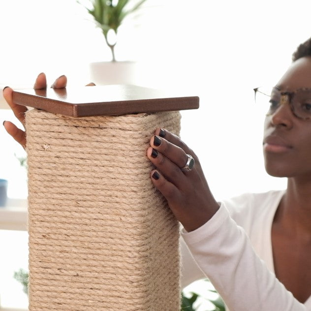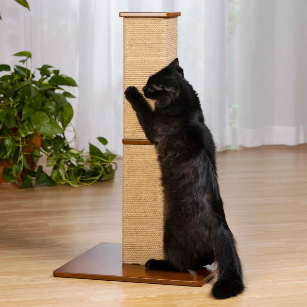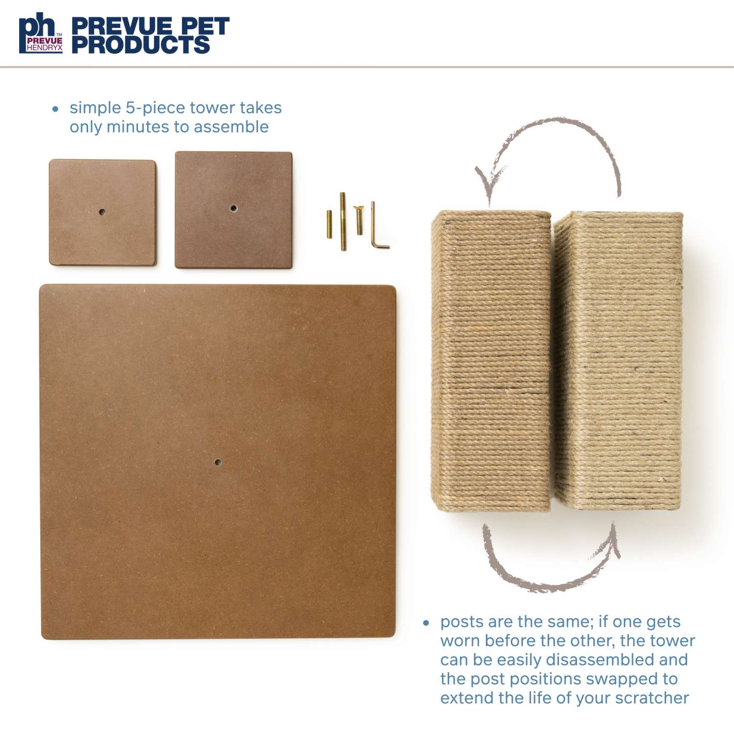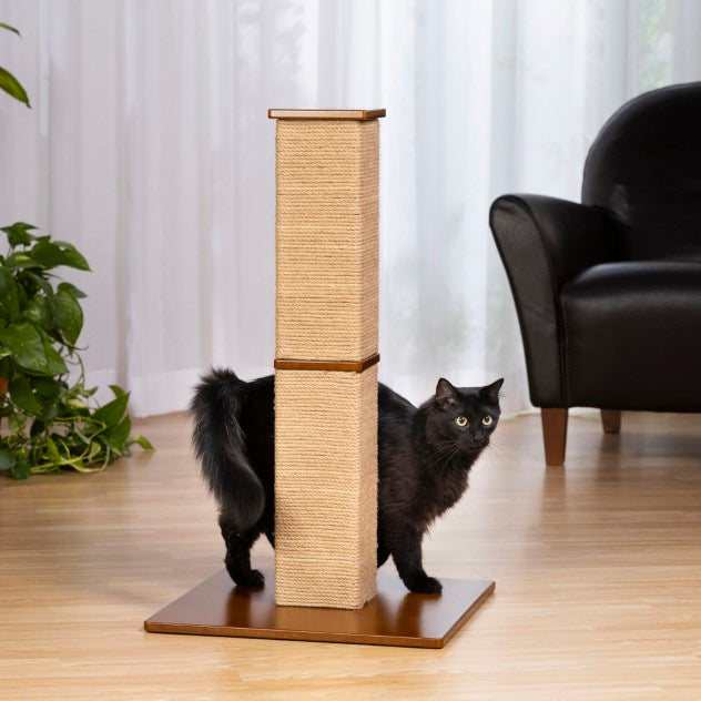 Prevue Pet Gemini Tall Square Scratching Post provides a dedicated place for scratching and stretching, alleviating destructive behavior to household objects. At 32" tall your cat gets a full vertical stretch and healthy exercise while keeping nails groomed and paws strong. Handsomely finished base, post divider and cap provide a furniture feel to complement the durable jute wrapped post and integrate with your room décor. One unique feature of the Gemini is the two-piece post. Top and bottom pieces are identical and interchangeable, this exclusive design means as one half gets worn, you simply disassemble the unit, swap positions of the worn post with the lesser worn post and reassemble. You’ll get twice the life out of your scratching post!