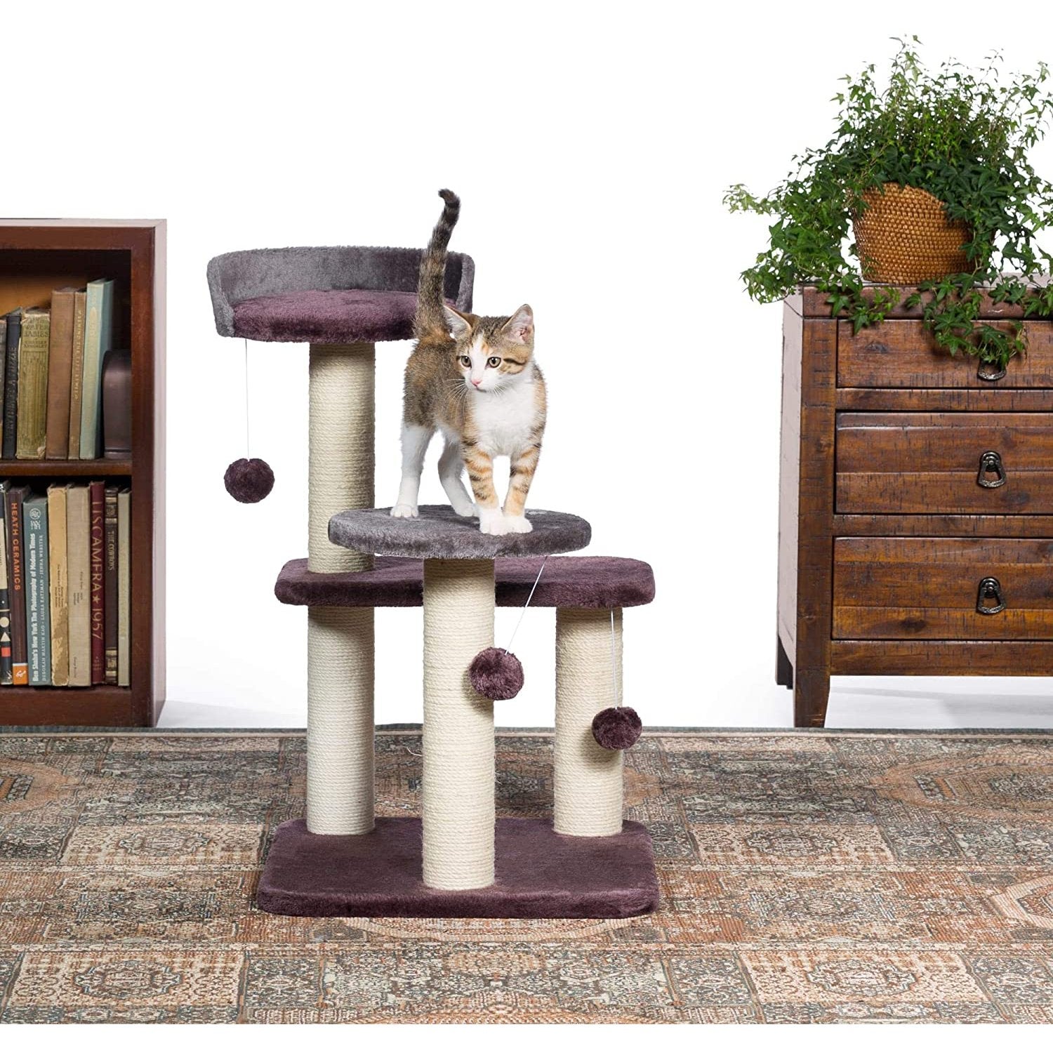 Three plush, dangling, swat toys hang playfully - one from the cat bed and one from each plush platform. Four individual, natural, jute rope scratching posts offer an appealing texture to cats, curbing inappropriate scratching behaviors and saving your sofa. Expertly designed cat furniture assembles easily and satisfies the needs of cats of all ages, sizes and activity levels.