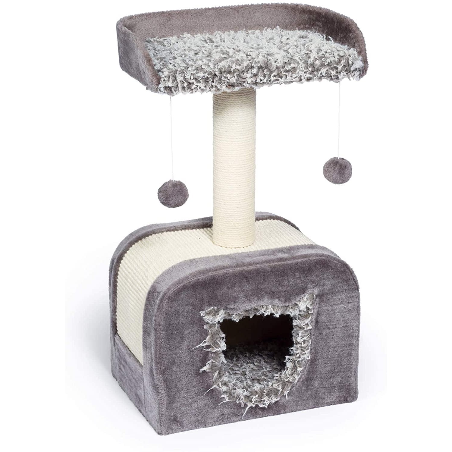 Prevue Pet Products Kitty Power Paws Shag Hideaway 7304 combines plush fabrics with durable jute and natural sisal to provide the perfect place for sleeping, scratching, hiding and playing. In varying shades of Gray the Shag Hideaway cat tree features a soft, shaggy, day bed with a "U" shaped back, making kitty feel more secure. 2 swat toys hang playfully while jute rope scratching posts offer an appealing texture to cats, curbing inappropriate scratching.