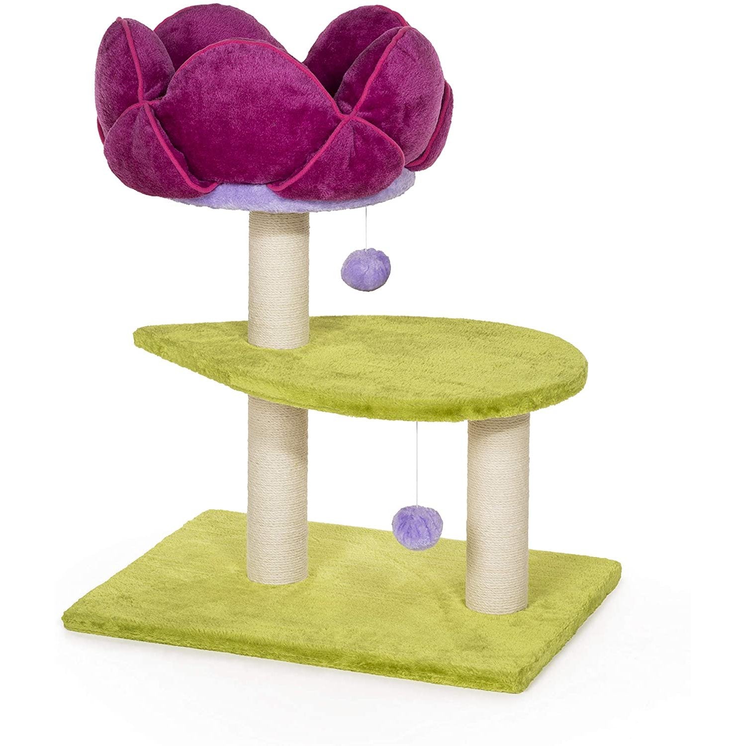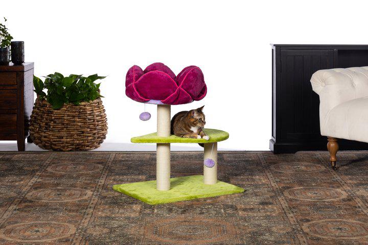 Prevue Pet Products Flower Power 7320 combines super soft, plush fabrics with durable jute to provide the perfect place for your cat to sleep, lounge and play. Two plush, dangling swat toys and lounging platform provide opportunities for pouncing and jumping. Two individual, natural, jute rope scratching posts offer an appealing texture to cats, curbing inappropriate scratching behaviors. Our incredibly plush flower bed encompassed in velvety soft pillows to surround your feline in total comfort while making your cat or kitten feel more secure and less vulnerable to sneak attacks. Our whimsical flower design in bold shades of fuchsia and lime green is sure to add a delightful presence to any room.