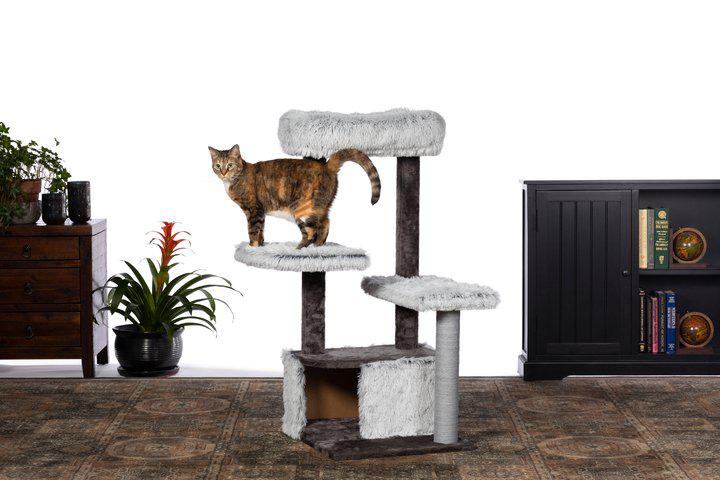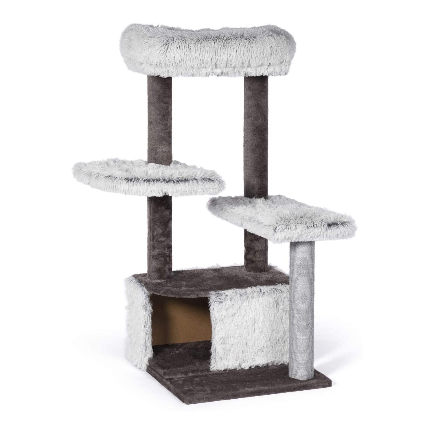 Prevue Pet Products Frosty Lounge 7323 combines super soft, plush fabrics with durable jute to provide the perfect place for lounging, sleeping, scratching, hiding, and playing. Our Frosty Lounge measures 3 1/2 feet tall A large plush bolstered day bed is a great spot for your kitten or cat to survey its surroundings or take a cat nap. Shag covered platforms provide opportunities for pouncing and jumping or multiple levels for more than one cat to lounge comfortably. Our cozy cave, lower level, hideaway makes your cat or kitten feel more secure and minimizes social stress. Rugged jute rope scratching post offers an appealing texture to cats, curbing inappropriate scratching behaviors. Our Frosty Lounge comes in dark gray and frost white and is a warm and welcoming addition to any home decor.