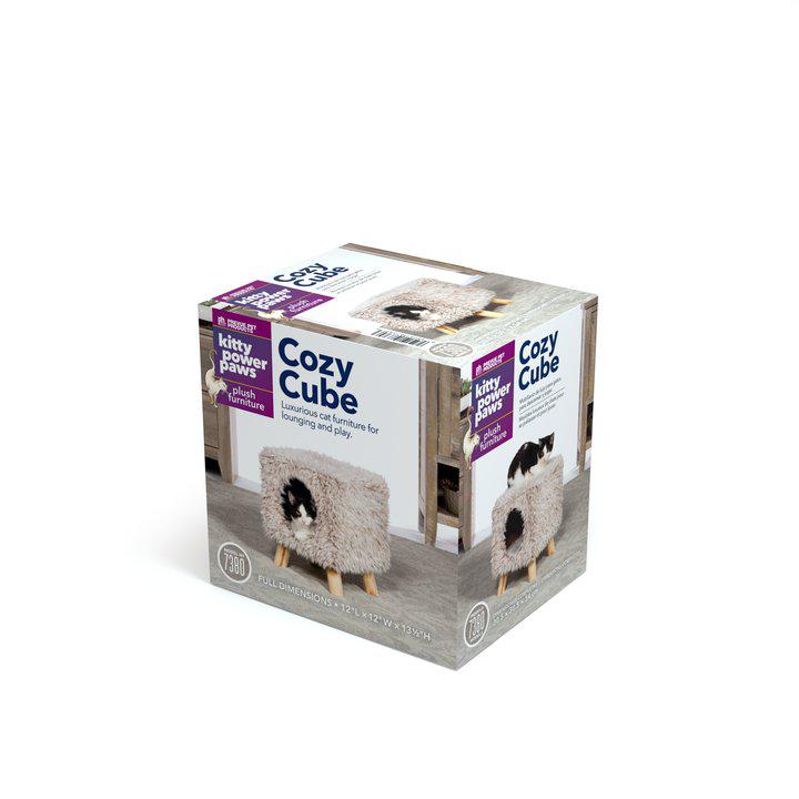 Prevue Pet Products Cozy Cube Frost Tan 7380 is a comfy and stylish hideout for your cat or small dog. Ultra-soft, plush, shaggy tan fabric covers the cube and interior floor, providing a covered hideaway where your cat or kitten will feel more secure and avoid social stress. Your pet will love lounging, sleeping or surveying their surroundings from the top of the cube. Frost Tan fabric combined with light colored wooden legs lends a furniture feel, ensuring this cat condo will complement your décor. Our Tan Cozy Cube measures 12’’ long, 12’’ wide and 13 ½’’ high with a 7’’ diameter hideaway opening. Great for pets and kids. Weight limit of 100 lbs.