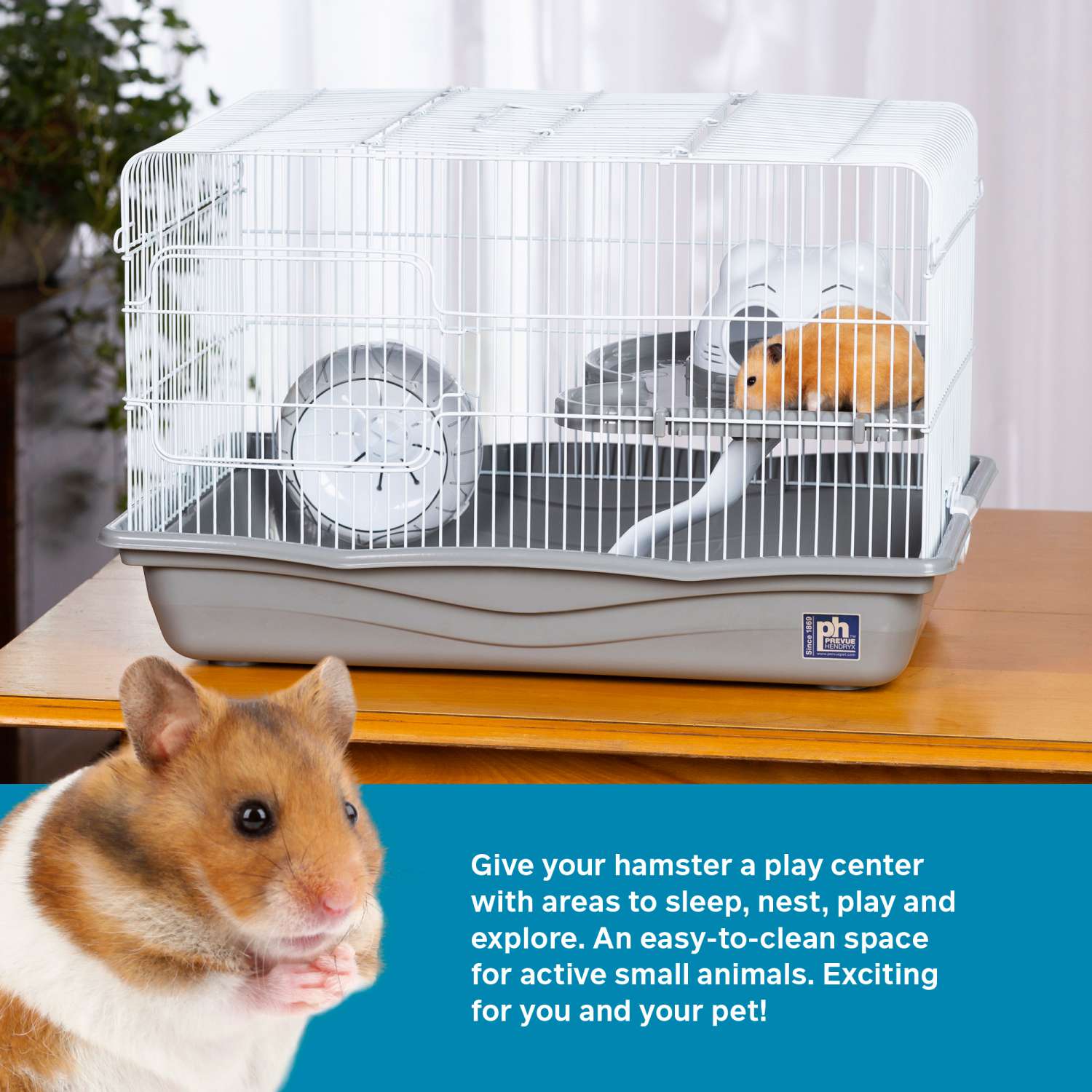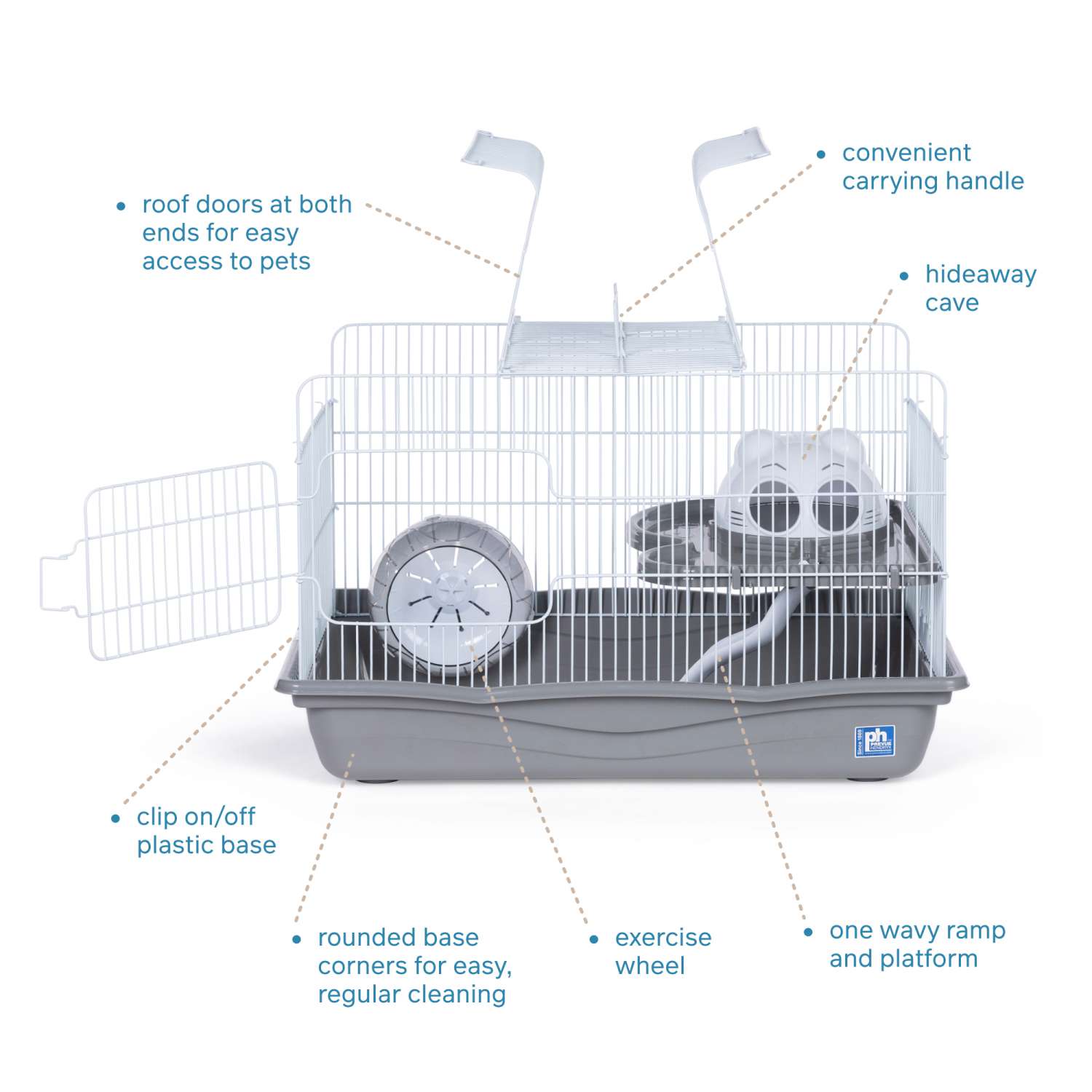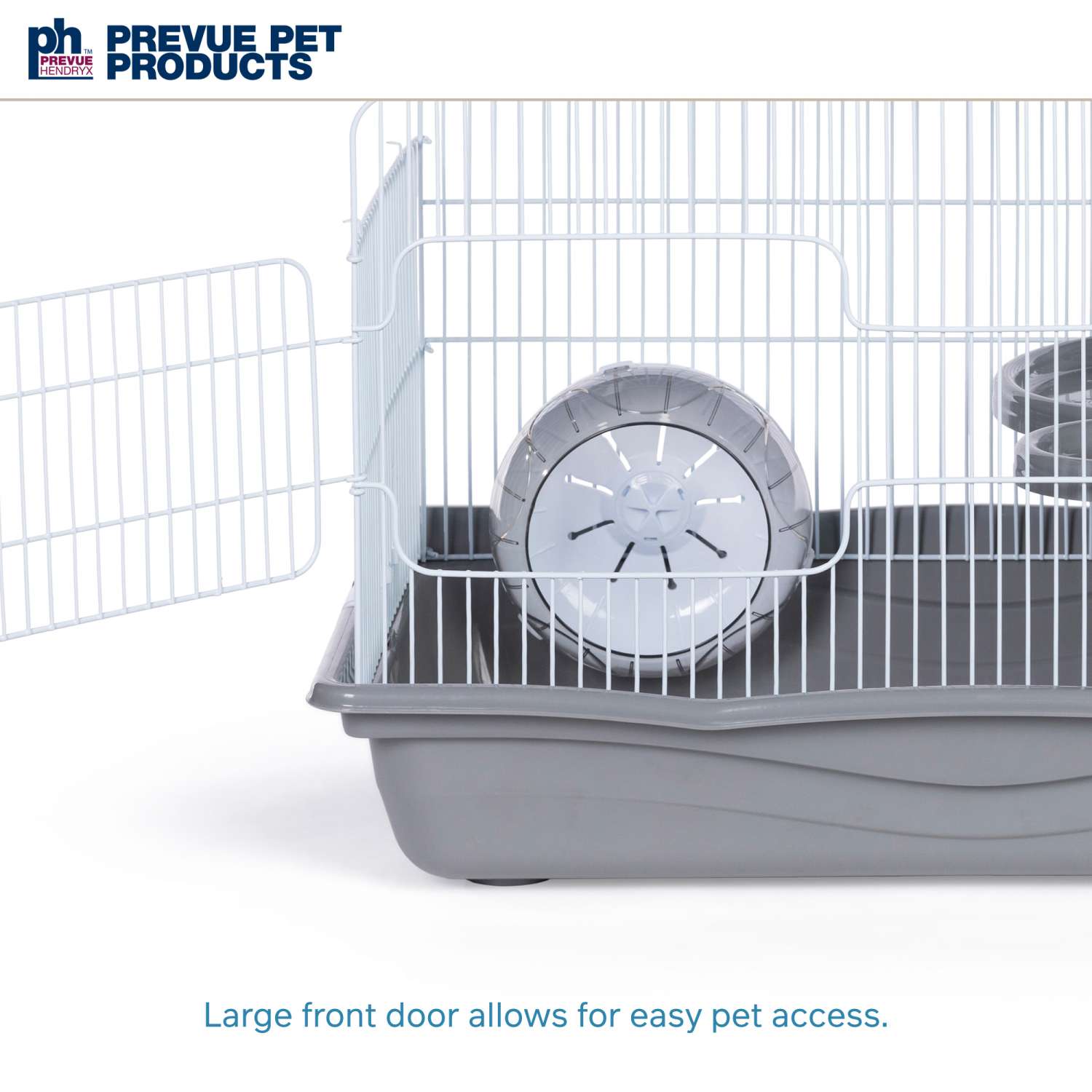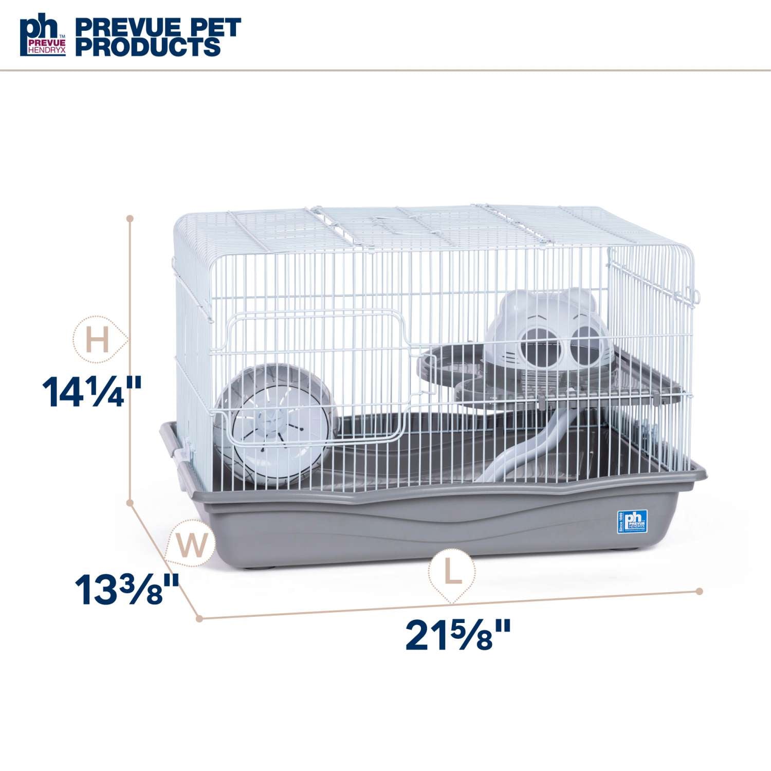 Prevue Pet Products Large Hamster Haven in Gray SP2005GRAY is a spacious and fun home for your hamster. Bi-level cage provides plenty of options for healthy activity and also satisfies your pets natural instincts to explore, hide and play above ground level. Multi-color components include platform, slide ramp, hideaway dome and exercise wheel. Featuring two access points, this vibrantly colored hamster cage has one front door and a larger, top-opening door. Cage measures 21 5/8" Long, 13 3/8" Wide and 14 1/4" High with 1/2" wire spacing.