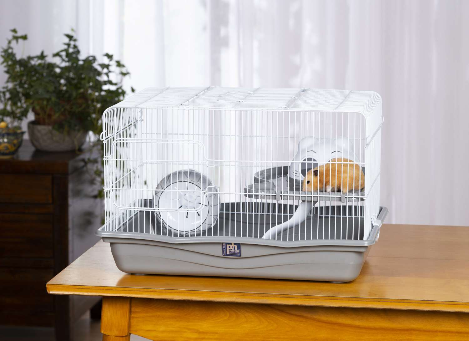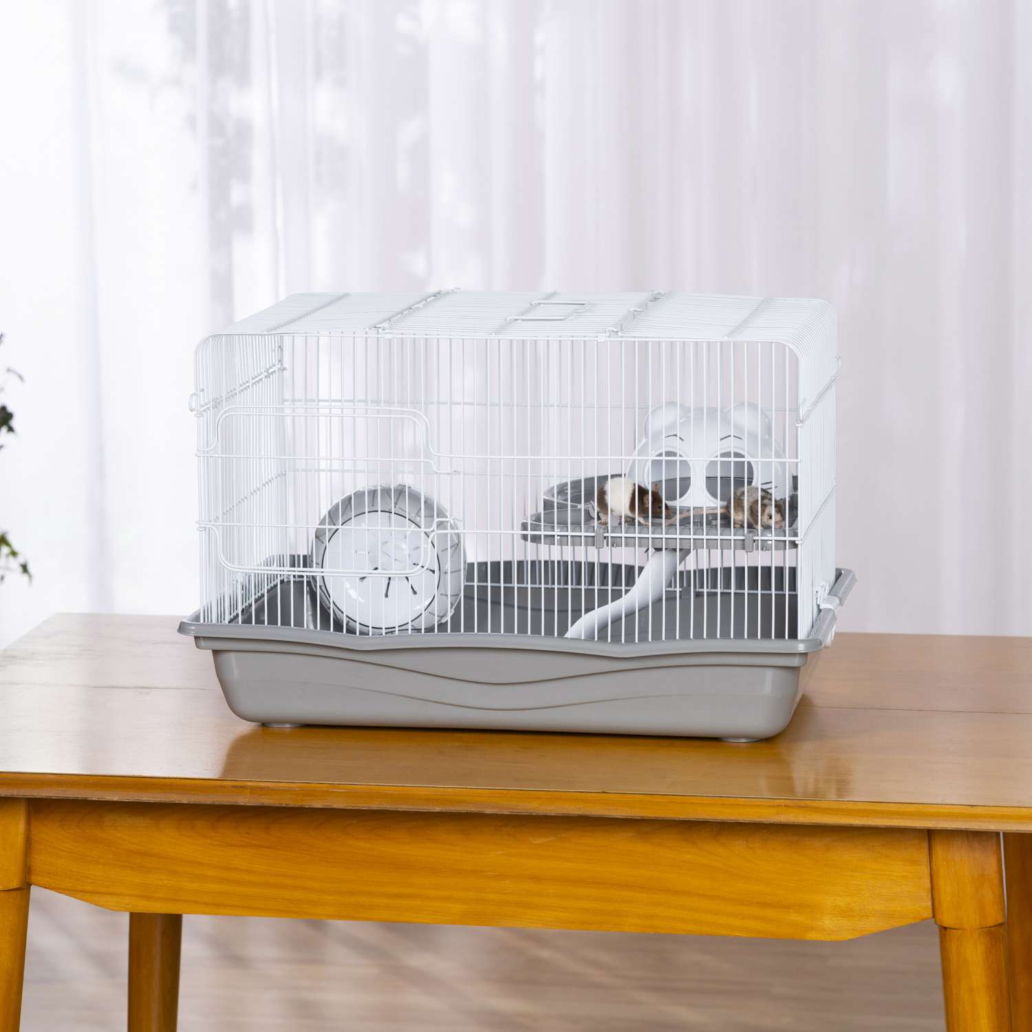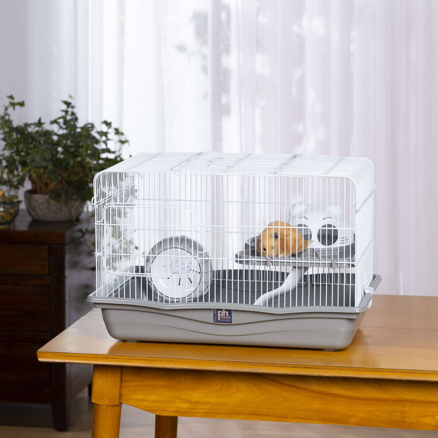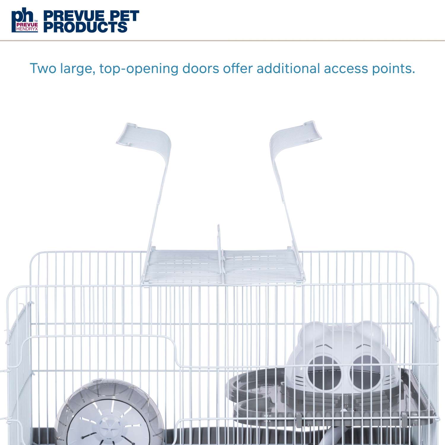 Prevue Pet Products Large Hamster Haven in Gray SP2005GRAY is a spacious and fun home for your hamster. Bi-level cage provides plenty of options for healthy activity and also satisfies your pets natural instincts to explore, hide and play above ground level. Multi-color components include platform, slide ramp, hideaway dome and exercise wheel. Featuring two access points, this vibrantly colored hamster cage has one front door and a larger, top-opening door. Cage measures 21 5/8" Long, 13 3/8" Wide and 14 1/4" High with 1/2" wire spacing.