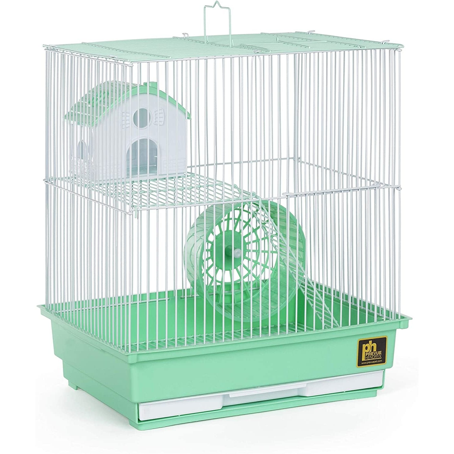 Prevue Pet Products Green two-story hamster and Gerbil cage SP2010GR is a complete home for your hamster or Gerbil. The included ladder, platform and house provide a place to play and hide while satisfying your pets natural instincts to be above ground level. Also included is an exercise wheel to keep your hamster or Gerbil entertained and maintain necessary activity levels. Owner friendly features include a top-opening door, allowing you to access both levels of this two-story cage, plus a removable bottom grille and pull-out tray for convenient cleaning. Purple base and Purple and white wire mesh colors coordinate perfectly with the included accessories. Ideal for hamsters and gerbils our two-story hamster and Gerbil cage measures 13 ½’’ long, 11’’ wide, 15 3/8’’ high with 3/8’’ Wire spacing