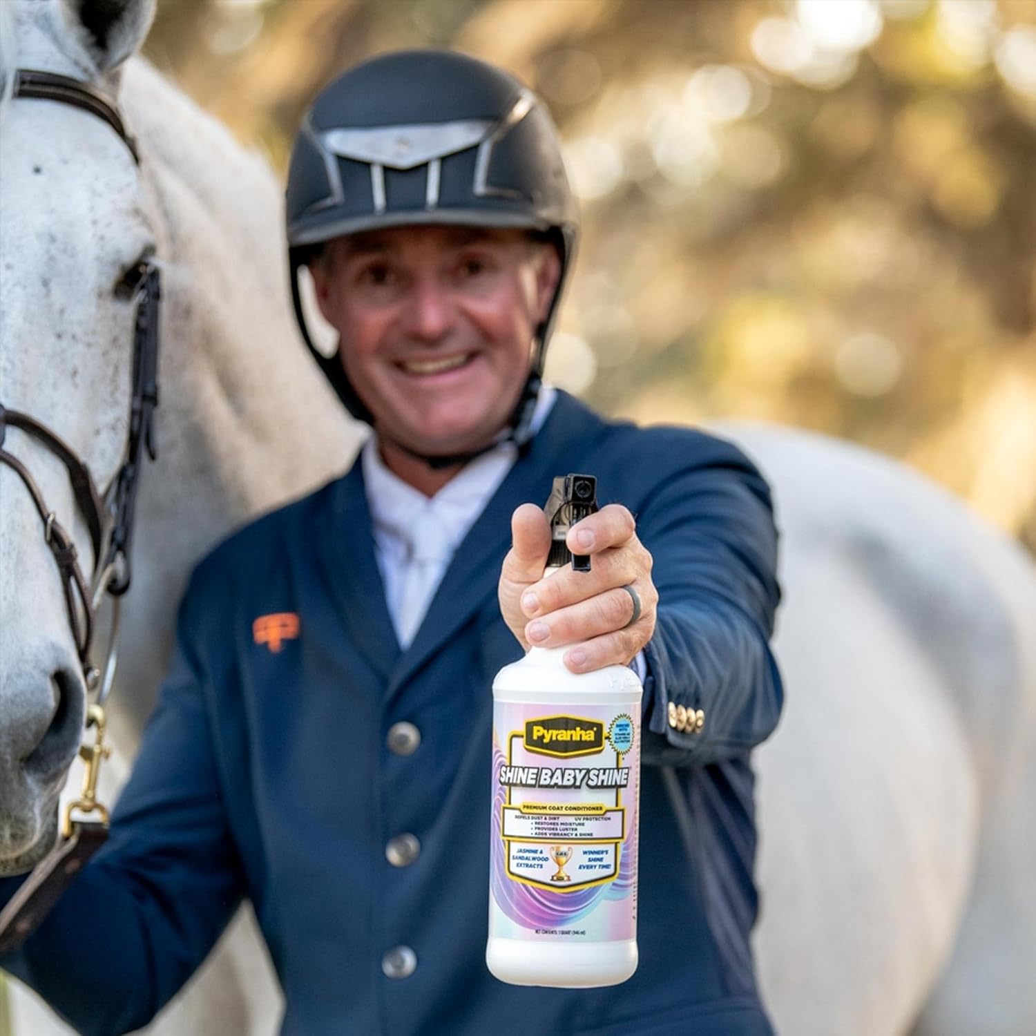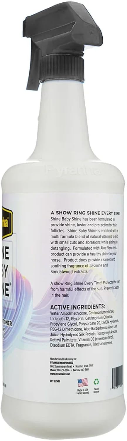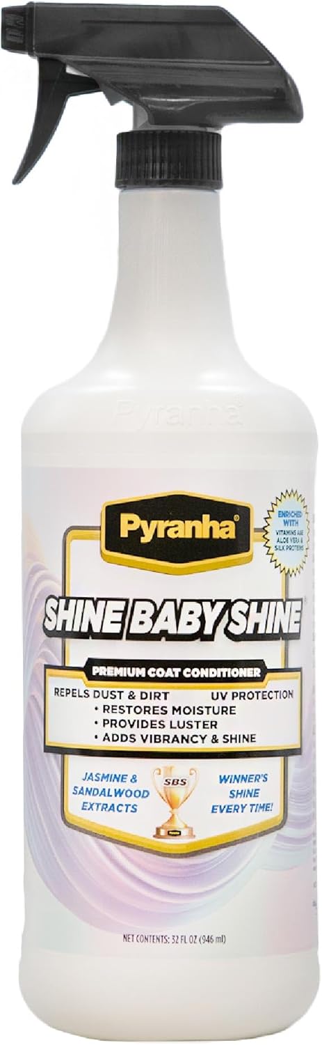 Shine Baby Shine by Pyranha provides a show ring shine every time! This easy-to-use spray detangles, conditions, and shines the coat, mane, and tail to keep your horse looking its best. The unique formula reduces static and protects against UV rays, making it perfect for use all year long. Enriched with aloe vera as well as natural vitamins, it even helps soothe and heal minor abrasions. Sandalwood and jasmine extracts provide a sweet soothing scent sure to be loved by both horses and humans.