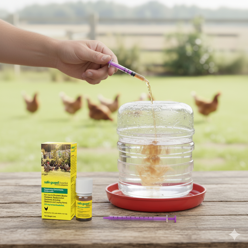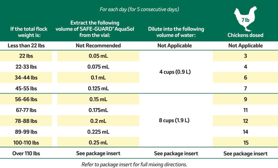 Deworm your backyard chickens safely with Safe-Guard AquaSol - the ONLY FDA-approved chicken dewormer for home use. This 3 mL water-soluble treatment offers easy 5-day deworming with no withdrawal period for eggs or meat. Simply add to morning drinking water for effective parasite control.