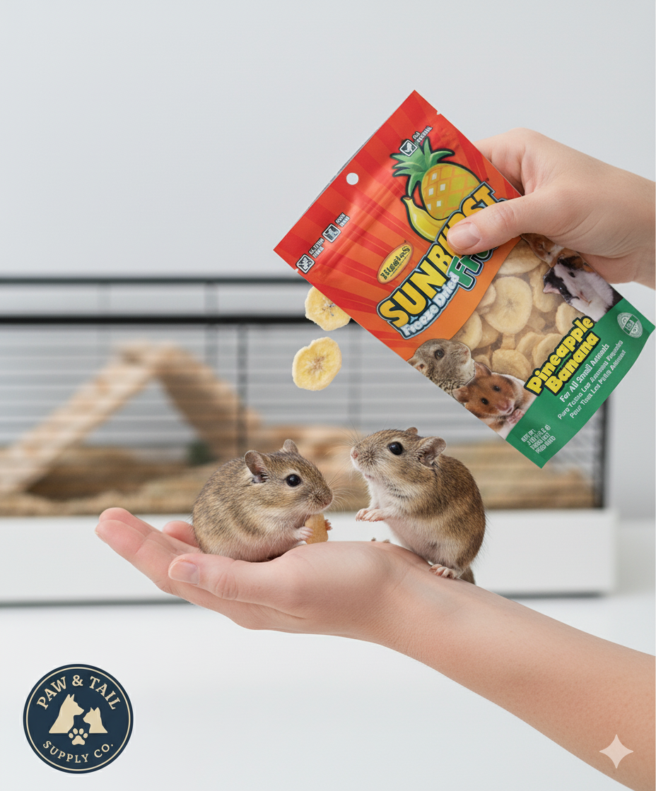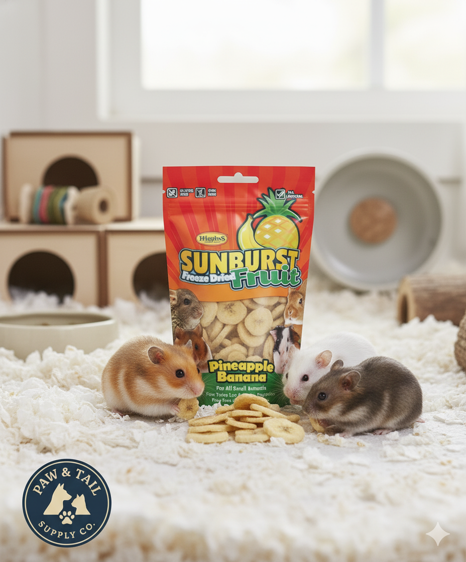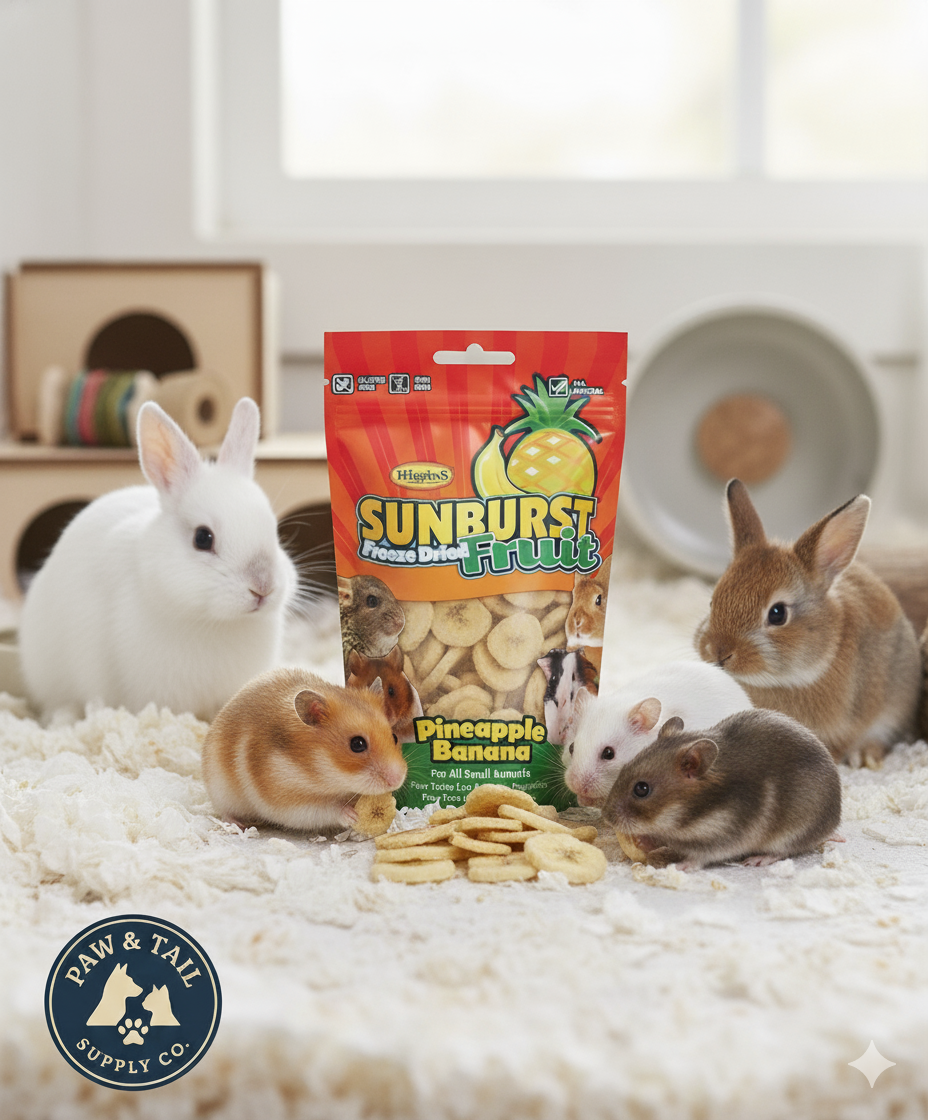 Higgins Sunburst Freeze-Dried Pineapple Banana .5 oz for all small animals. All-natural, whole-food treats. No added sugars, sulfites, preservatives, gluten or GMOs. Optimal ripeness for natural flavor. For rabbits, guinea pigs, hamsters, chinchillas & more.