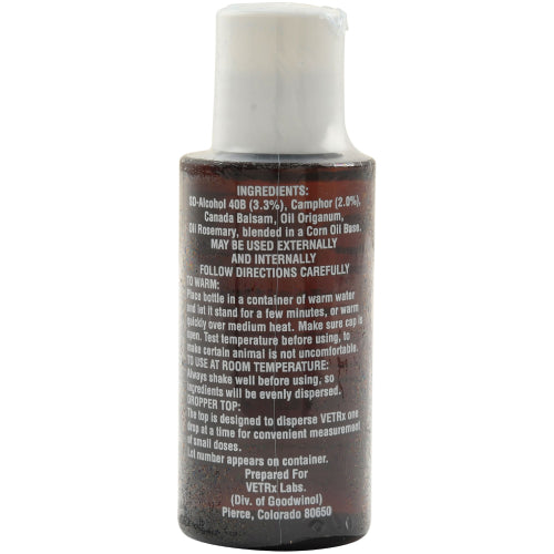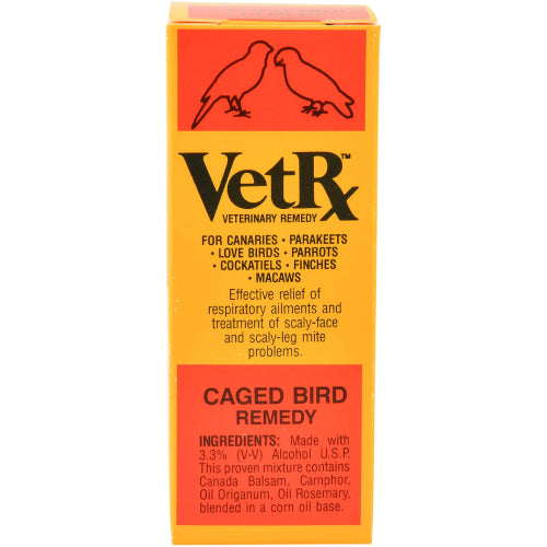 VetRx Caged Bird Remedy 2 oz for canaries, parakeets, parrots, cockatiels, finches & macaws. Relieves watery eyes, labored breathing, coughing, sneezing & loss of voice. Effective against scaly face & leg mites. Internal & external health support.