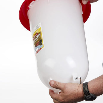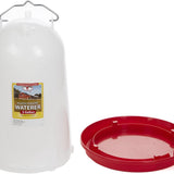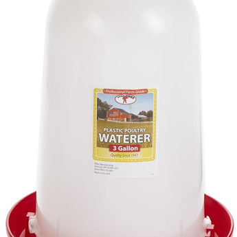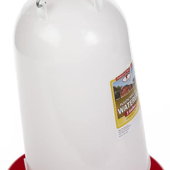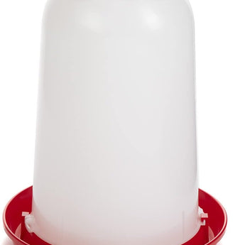 Little Giant Plastic Poultry Drinker provides constant water flow with its gravity-fed design and 3-gallon capacity. Made of heavy-duty polystyrene to withstand heat, cold, and cracks. Features a transparent jar so water level is always visible. Bright red base attracts birds. Simple screw-on design for easy assembly and disassembly.