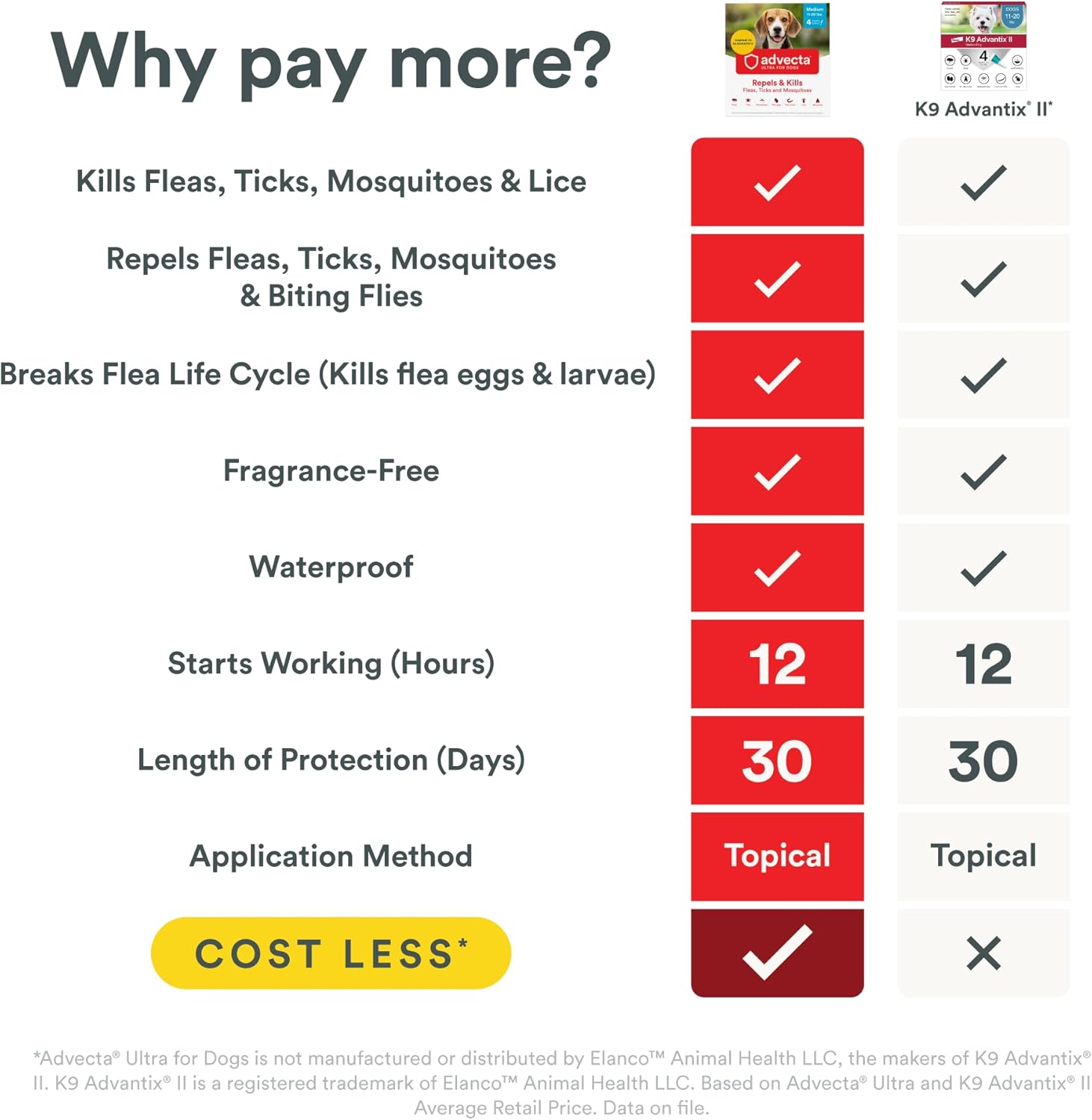 Advecta Ultra Flea & Tick Protection for Dogs uses the same active ingredients as K9 Advantix. Starts working through contact to kill and repel fleas, ticks, and mosquitoes within 12 hours with no prescription needed. Waterproof, fast-acting topical drops provide 30-day protection at an affordable price. 4-month supply for medium dogs and puppies.