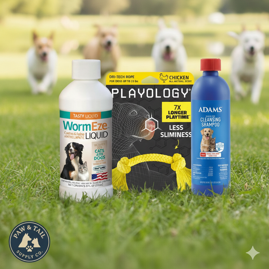 Dog Deworming & Flea Care Bundle WormEze 8oz + Adams Flea & Tick Shampoo 12oz + Chicken Rope Toy