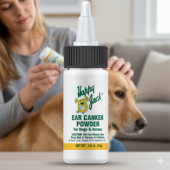 Happy Jack Ear Canker Powder brings complete recovery within two to five days, even on the most stubborn, chronic ear canker cases. This .5 oz powder promotes healing and dries up inner ear canker and external sore, moist areas. Contains zinc oxide and iodoform in an easy-to-apply squeeze container. Made in USA. For dogs and horses.