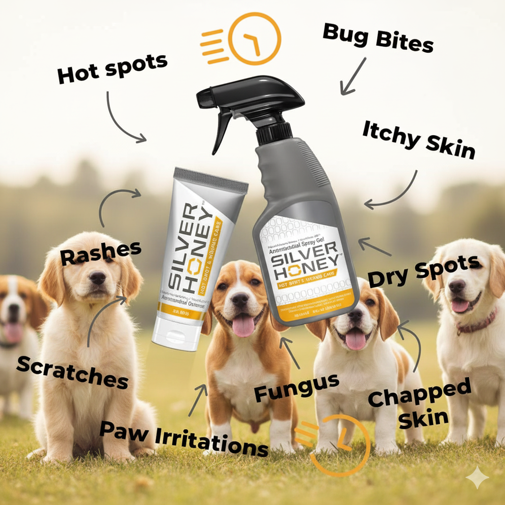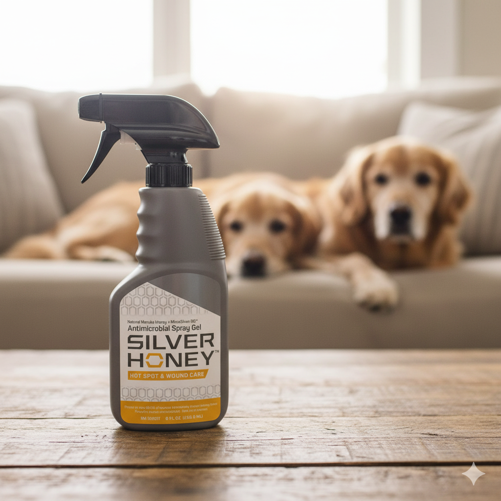 Absorbine Silver Honey Hot Spot & Wound Care Spray Gel combines Manuka Honey and MicroSilver BG to kill 99.9% of bacteria immediately. This 8 oz antibiotic-free spray gel provides touch-free application and continuous coverage for hot spots, dermatitis, cuts, rashes, and wounds. Soothes discomfort and reduces biting and scratching. Safe for dogs, cats, and small animals.