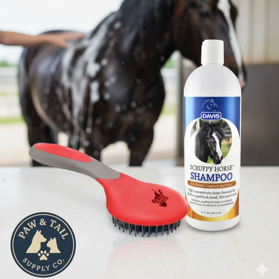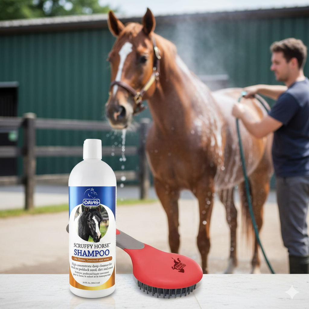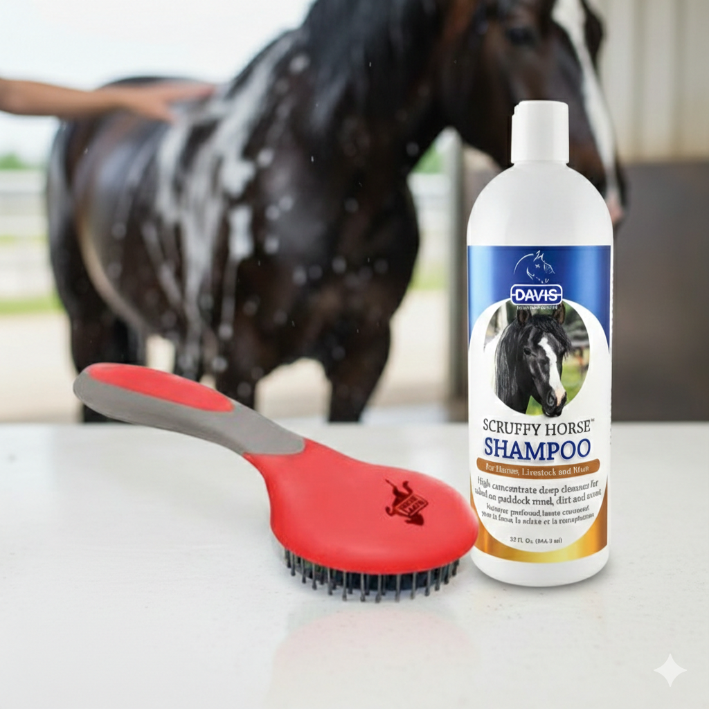 A simple, effective grooming bundle combining Davis Scruffy shampoo with a comfortable ball-tipped grooming brush for everyday horse care.