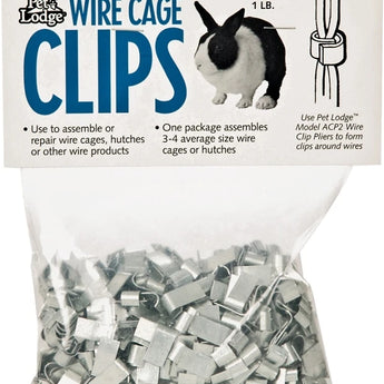 Pet Lodge 1 lb. Wire Cage Clips for assembling or repairing 14 to 16 gauge wire panels for rabbit hutches, pet homes, and other wire products. These ferrule-type clips wrap around wire or other material to fasten it securely. Great for various uses around the farm, home, and shop. Each 1-pound package contains enough clips to assemble three to four average-size wire units. For easy installation, use with the Pet Lodge Wire Clip Pliers (Item No. ACP2, sold separately).