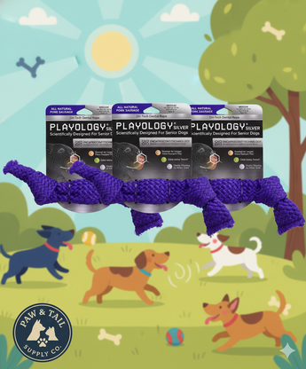 Playology Silver Dri-Tech Dental Rope Dog Toy (Medium) is designed for senior dogs with softer, slobber-wicking fibers for comfortable chewing. Features pork sausage all-natural scent with Encapsiscent Technology, plus crinkle and squeaker for engagement. Easy to clean and made from child-safe materials.