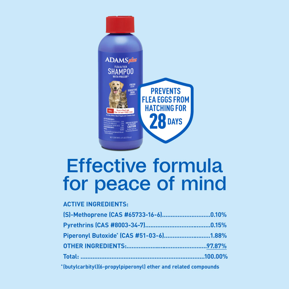 Adams Plus Flea and Tick Shampoo kills fleas, ticks, and lice, prevents flea eggs from hatching for up to 4 weeks, and enhances coat shine. Safe for puppies and kittens over 12 weeks, it contains Pyrethrins, Piperonyl Butoxide, and Pyriproxyfen. Directions: wet pet, apply shampoo, lather for 5 minutes, then rinse. Available in 1-gallon size.
