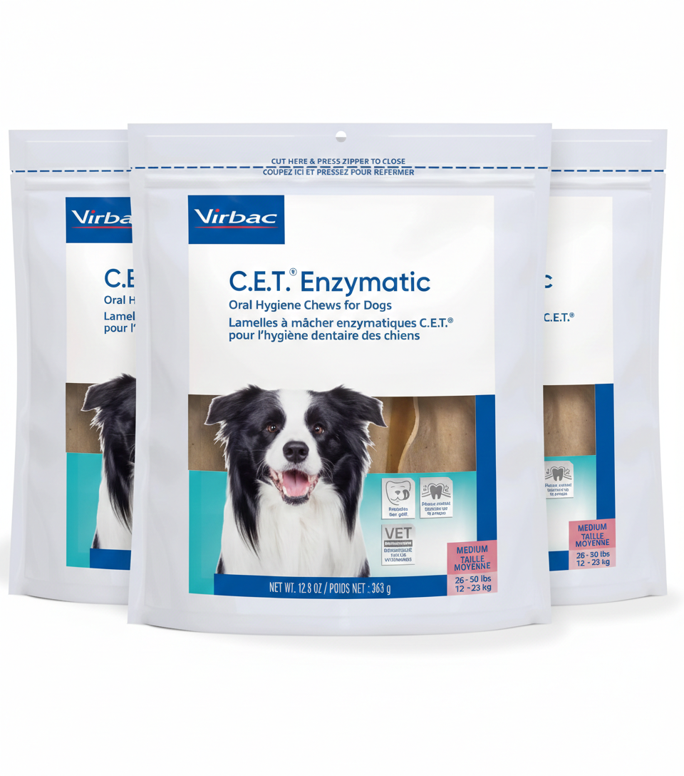 C.E.T. Enzymatic Oral Hygiene Chews help reduce plaque and tartar with a Dual-Enzyme System plus abrasive chew texture. Supports cleaner teeth and fresher breath when brushing isn’t possible. ~30 chews.