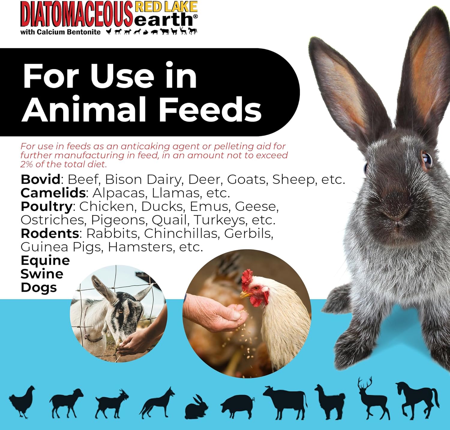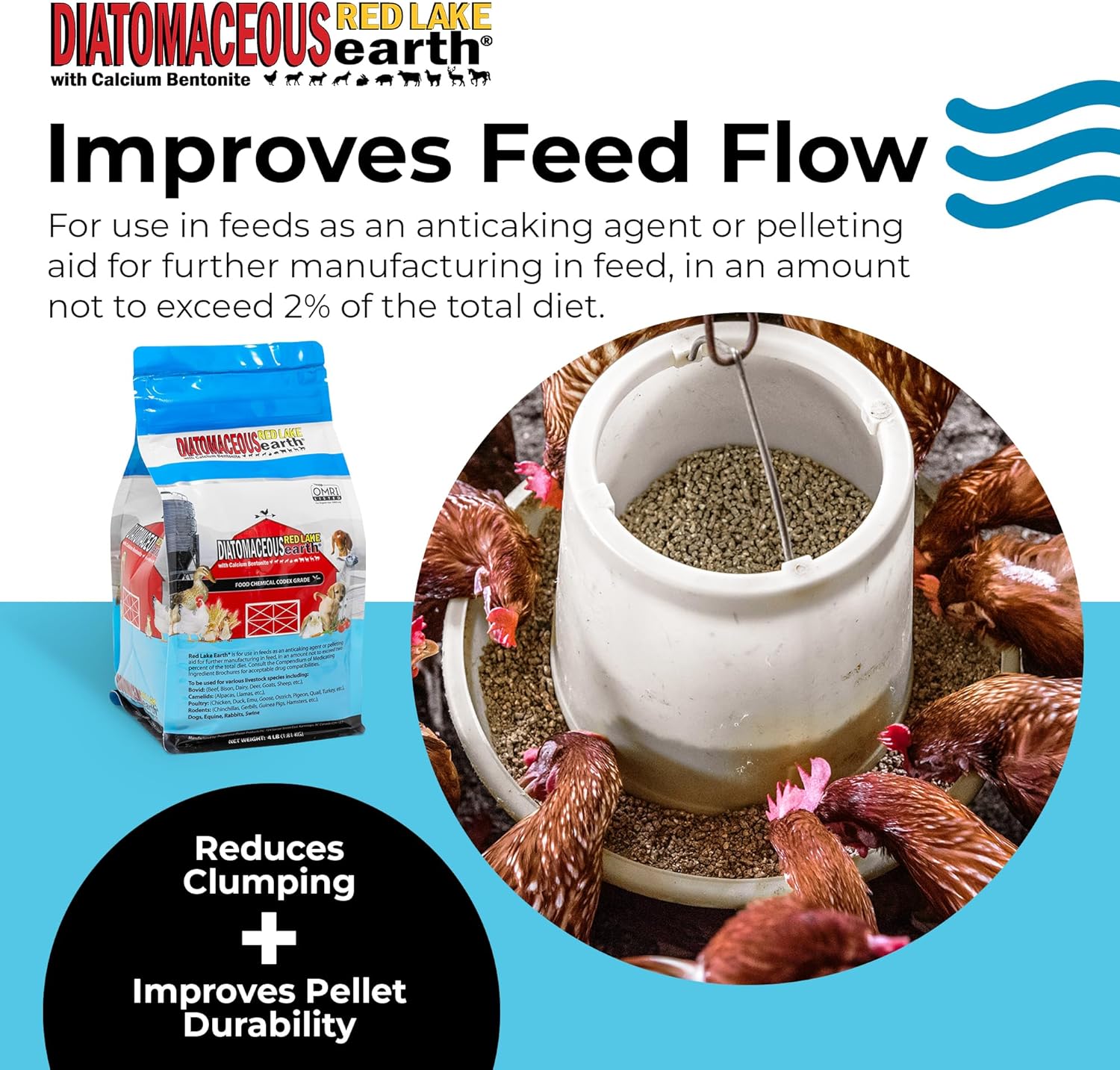 Red Lake Earth is a natural blend of Food Chemical Codex Grade Diatomaceous Earth and Calcium Bentonite. Registered for use in feeds as an anti-caking agent or pelleting aid for further manufacturing in feed, not to exceed 2% of total diet. Helps absorb moisture and prevents clumping, ensuring feed stays fresh and flows easily. Ideal for poultry, dairy cattle, horses, and more. 4 lb resealable bag.